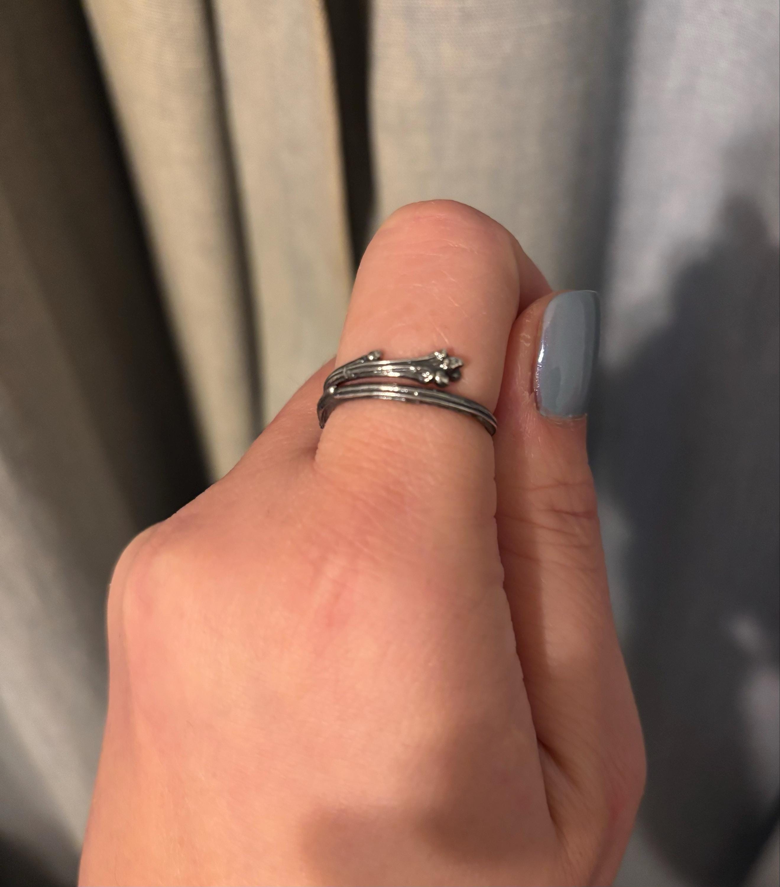 This ring is cast solid in sterling silver and available with a white silver finish or heavily oxidized black. Over time, and with wear, the black oxidation will wear off in places to show the detail of the twig. The width of the twig varies between 1.9mm-4.4mm and the depth varies between 1.7-2.6mm. It weighs approximately 2.6 grams.