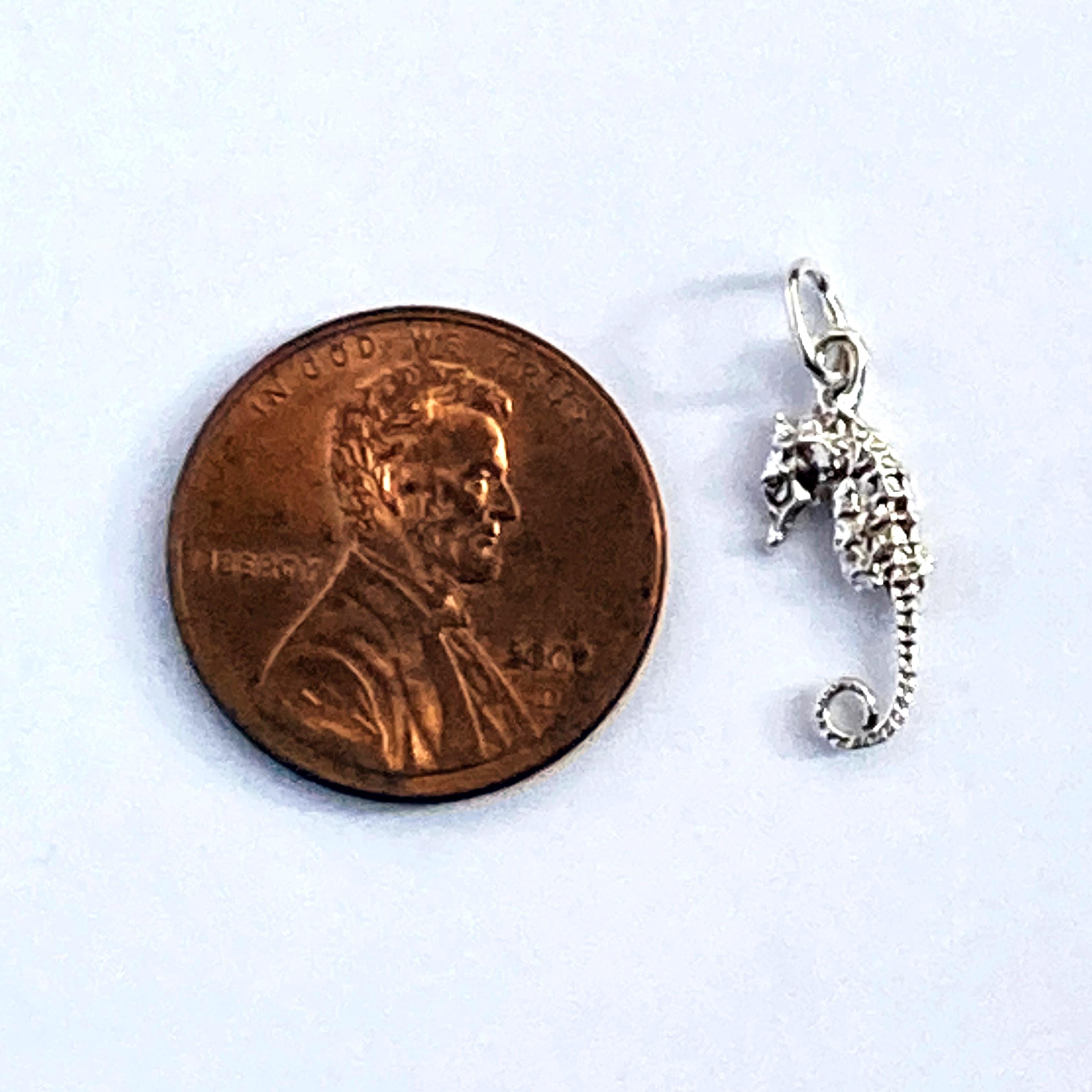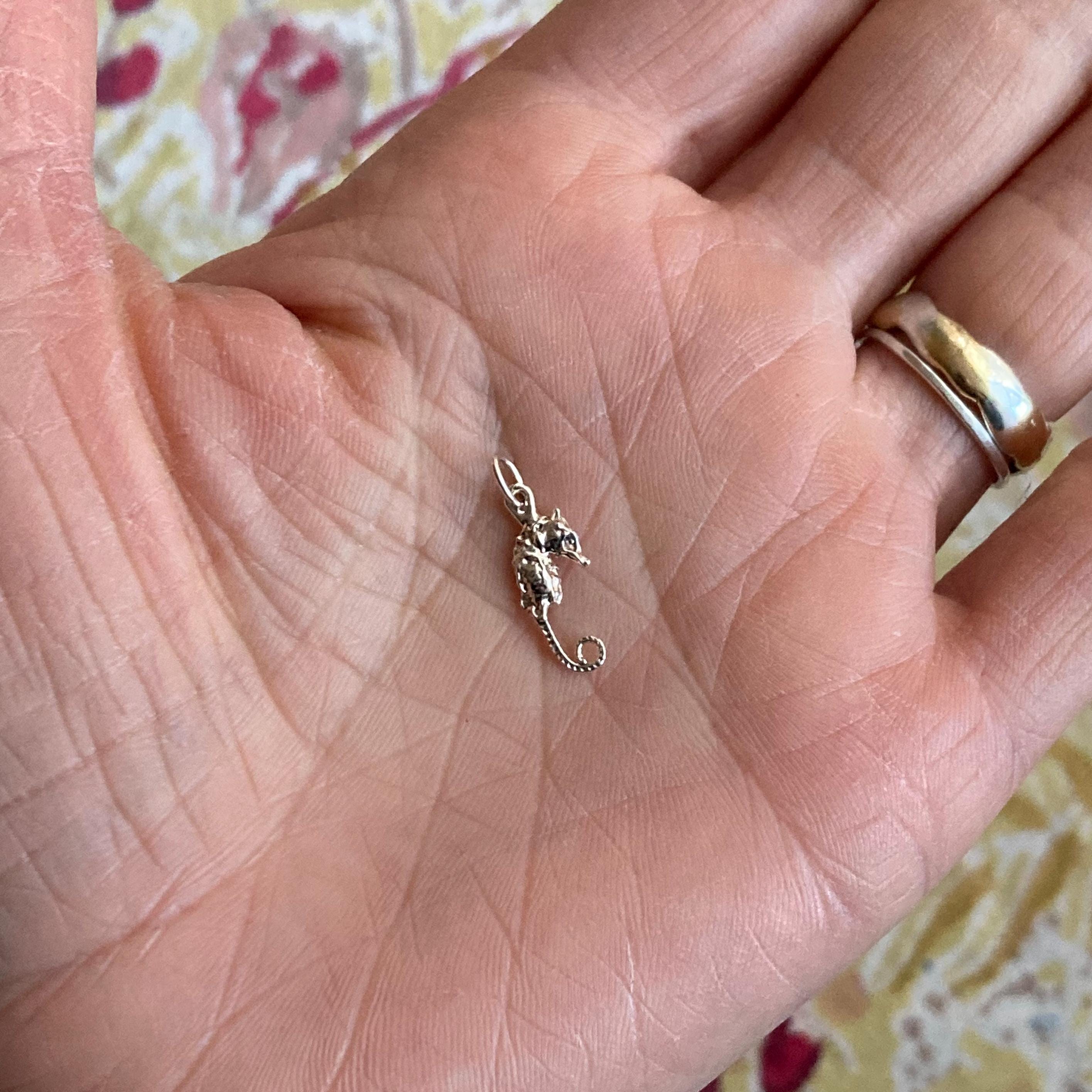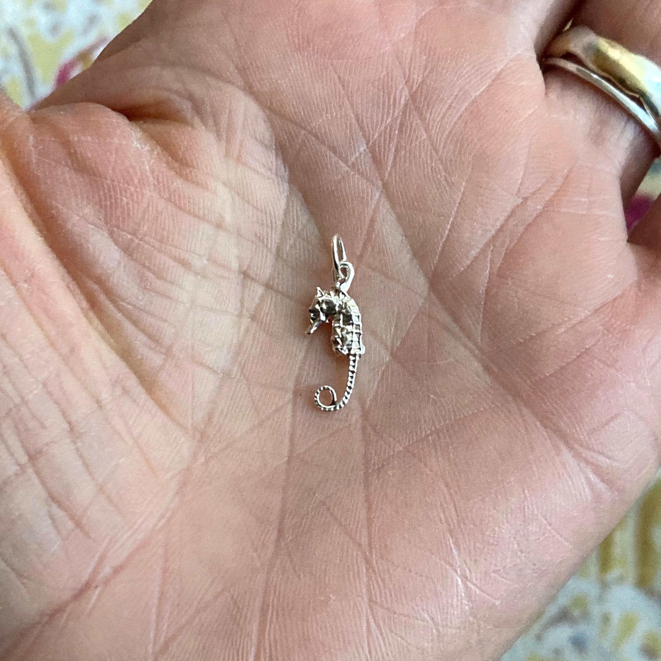 A tiny silver seahorse is hung on a 16" or 18" superfine sterling silver chain. Solid sterling silver pygmy seahorse measures approx. 14 mm x 6mm.