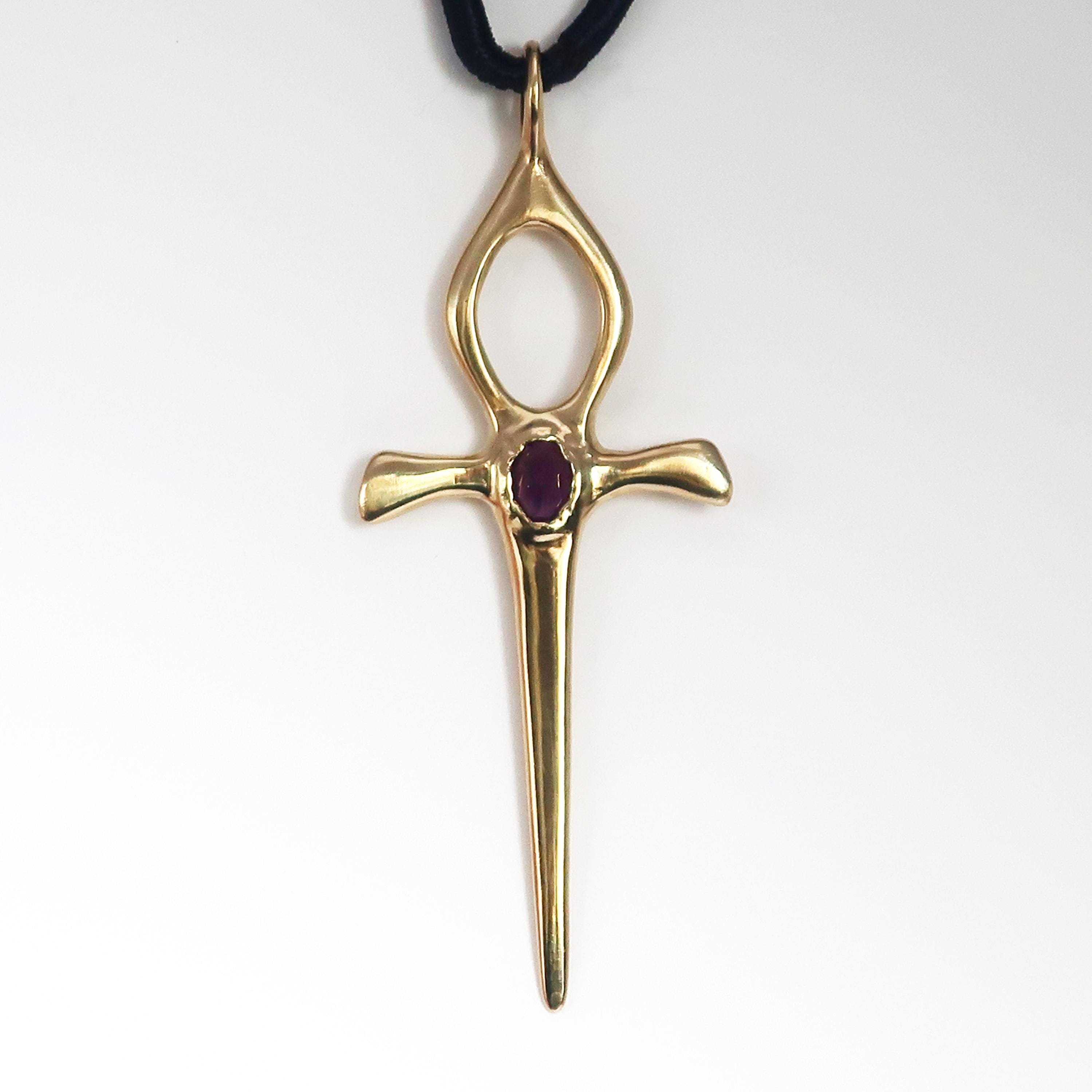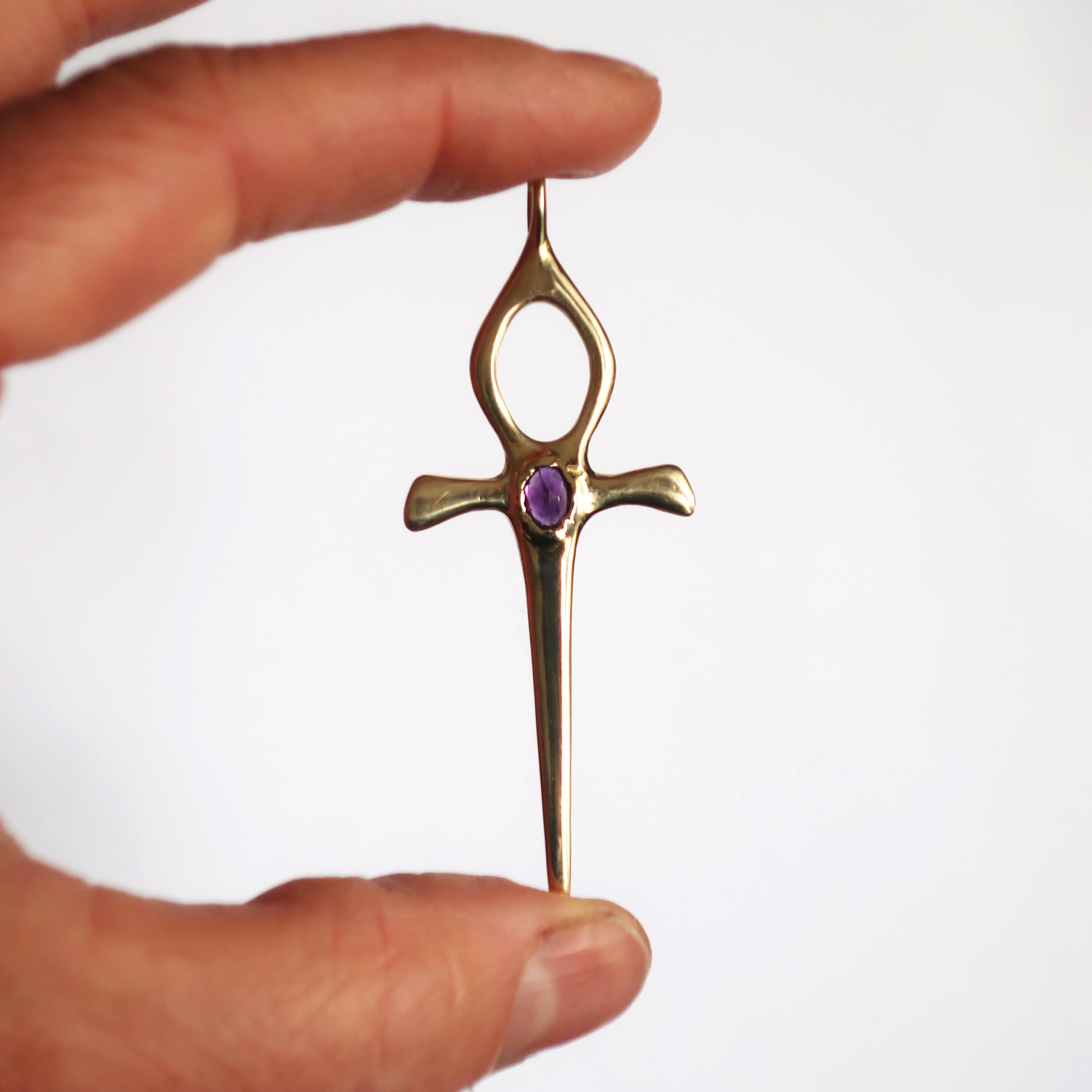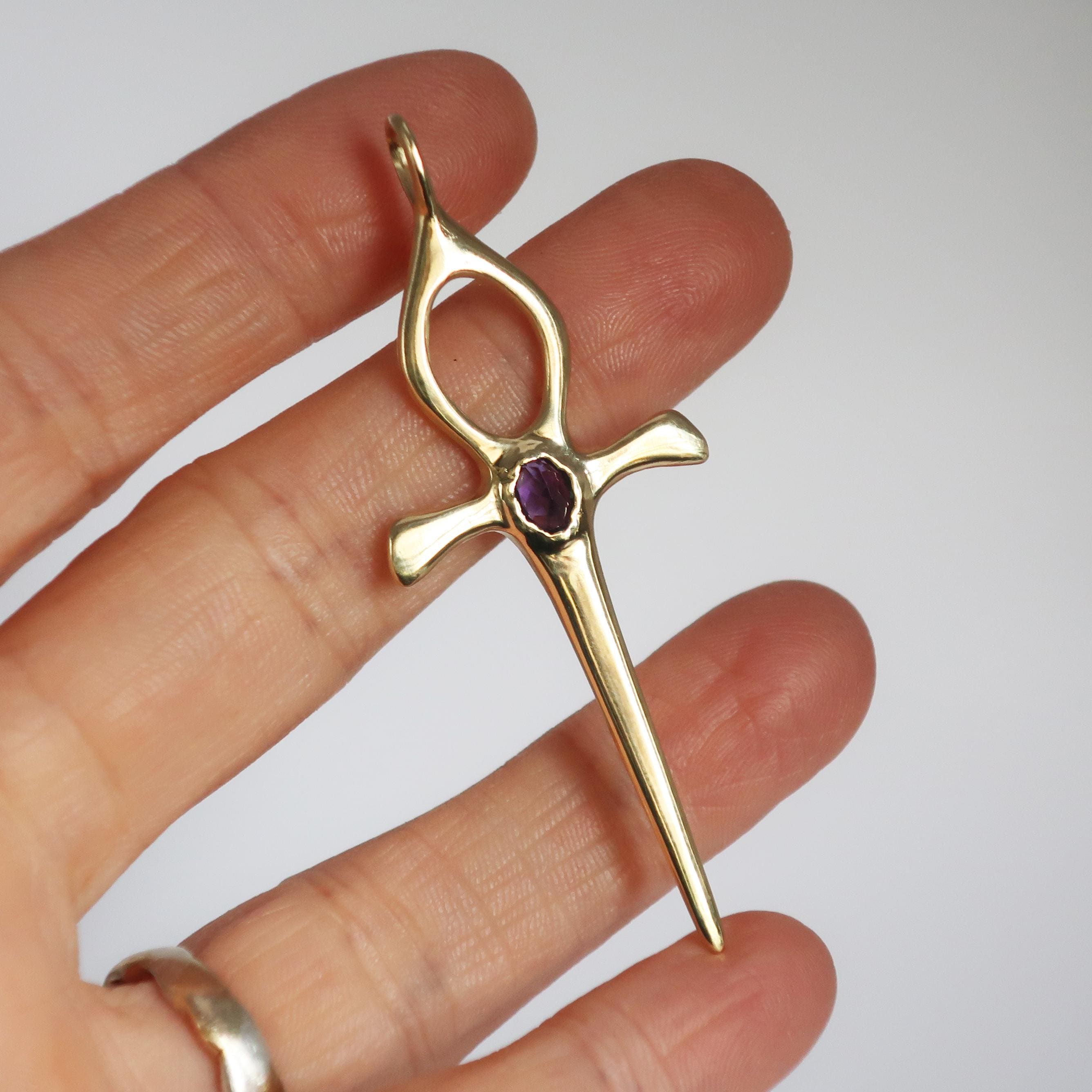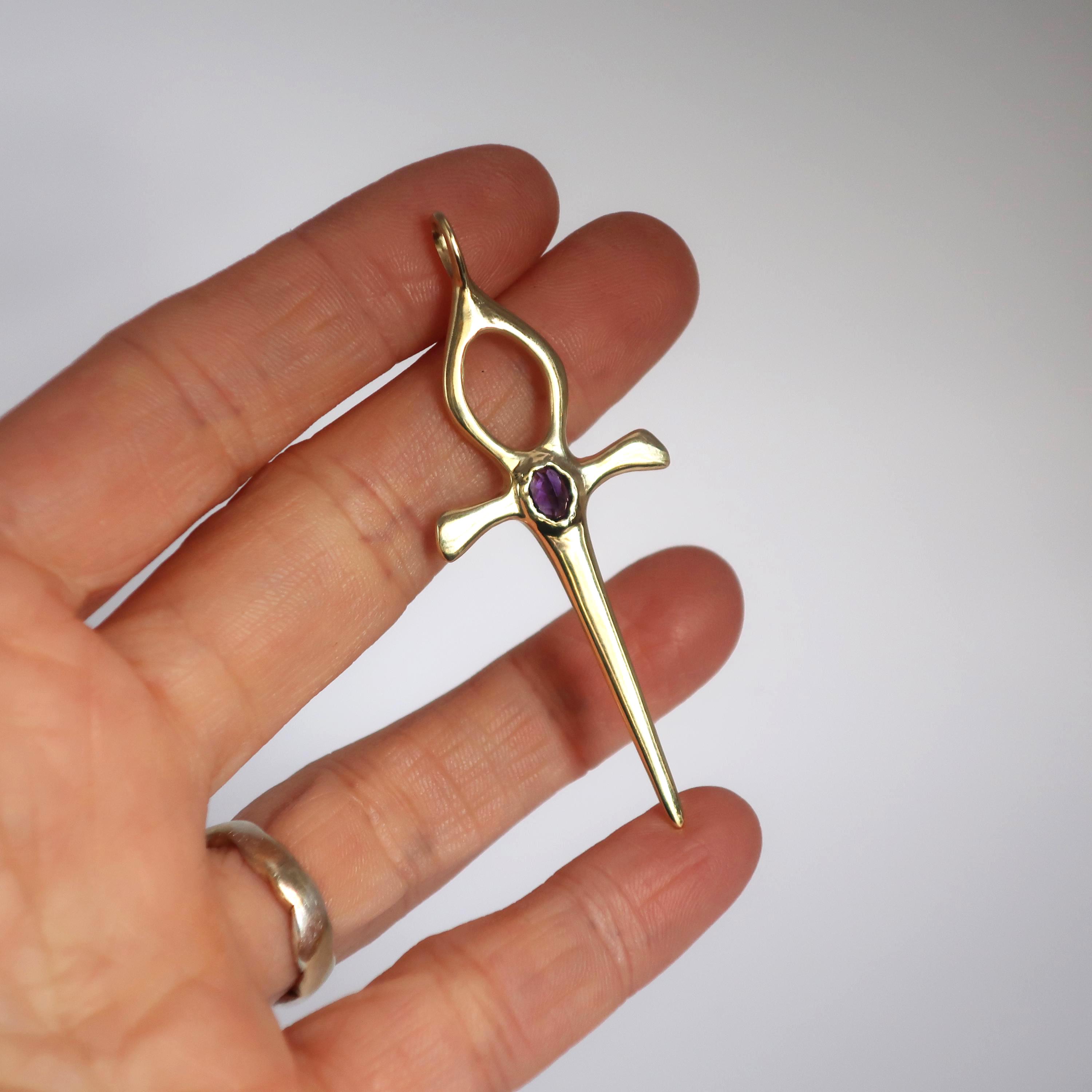 This Ankh Dagger is cast in solid brass and set with a genuine 5.5 x 4.5 mm faceted oval amethyst. The pendant measures 6.2 cm tall (including bail) x 2.4 cm wide and weighs approximately 4 grams.