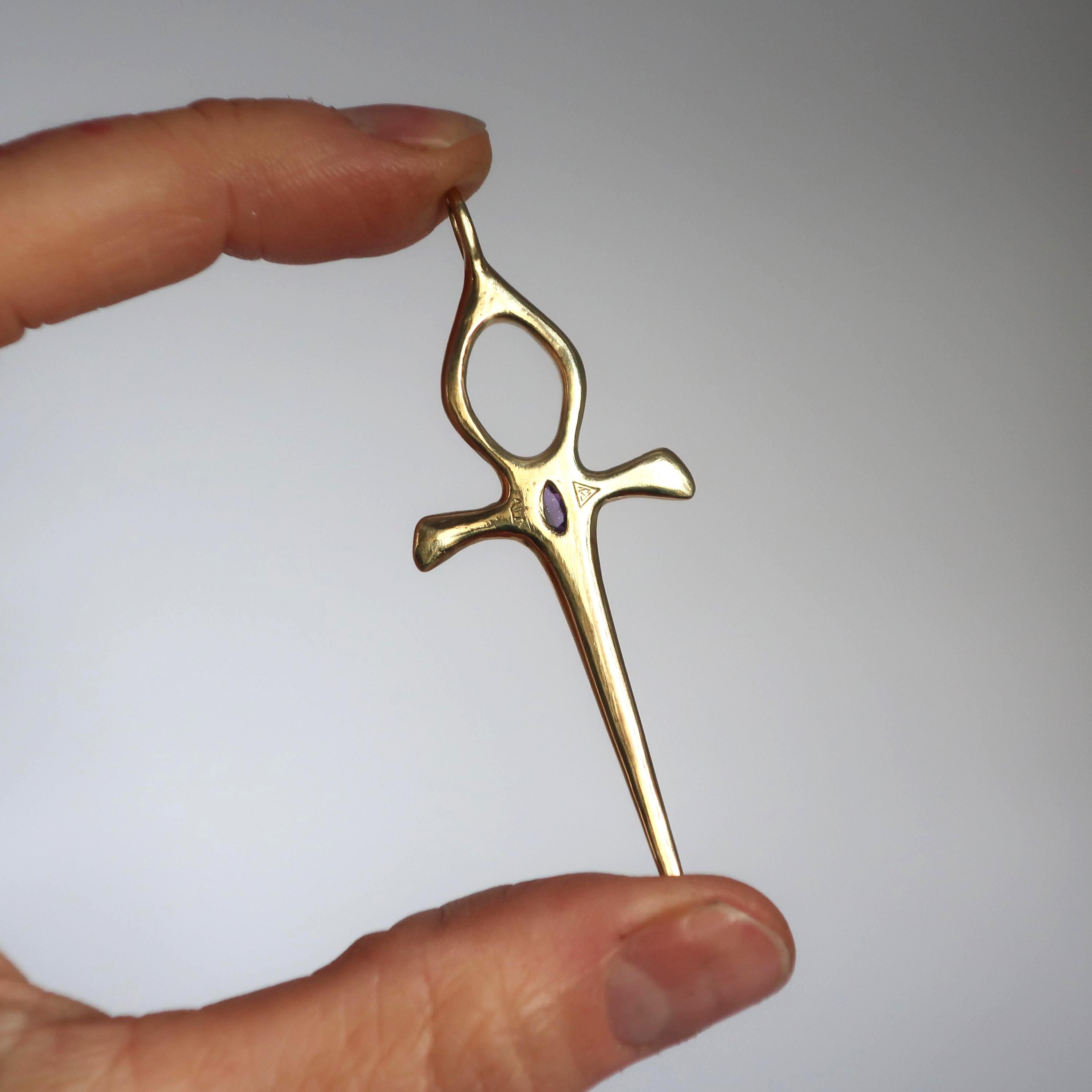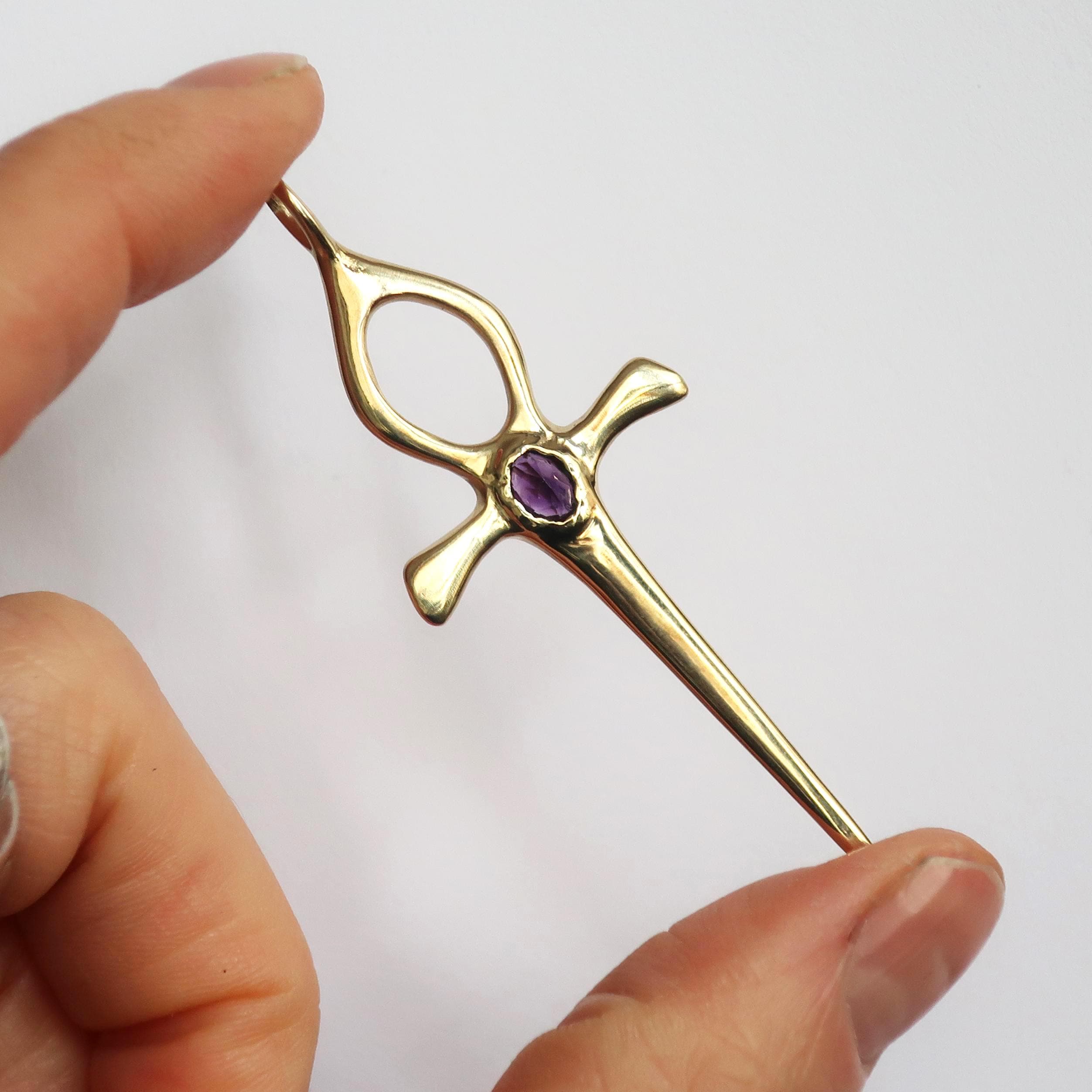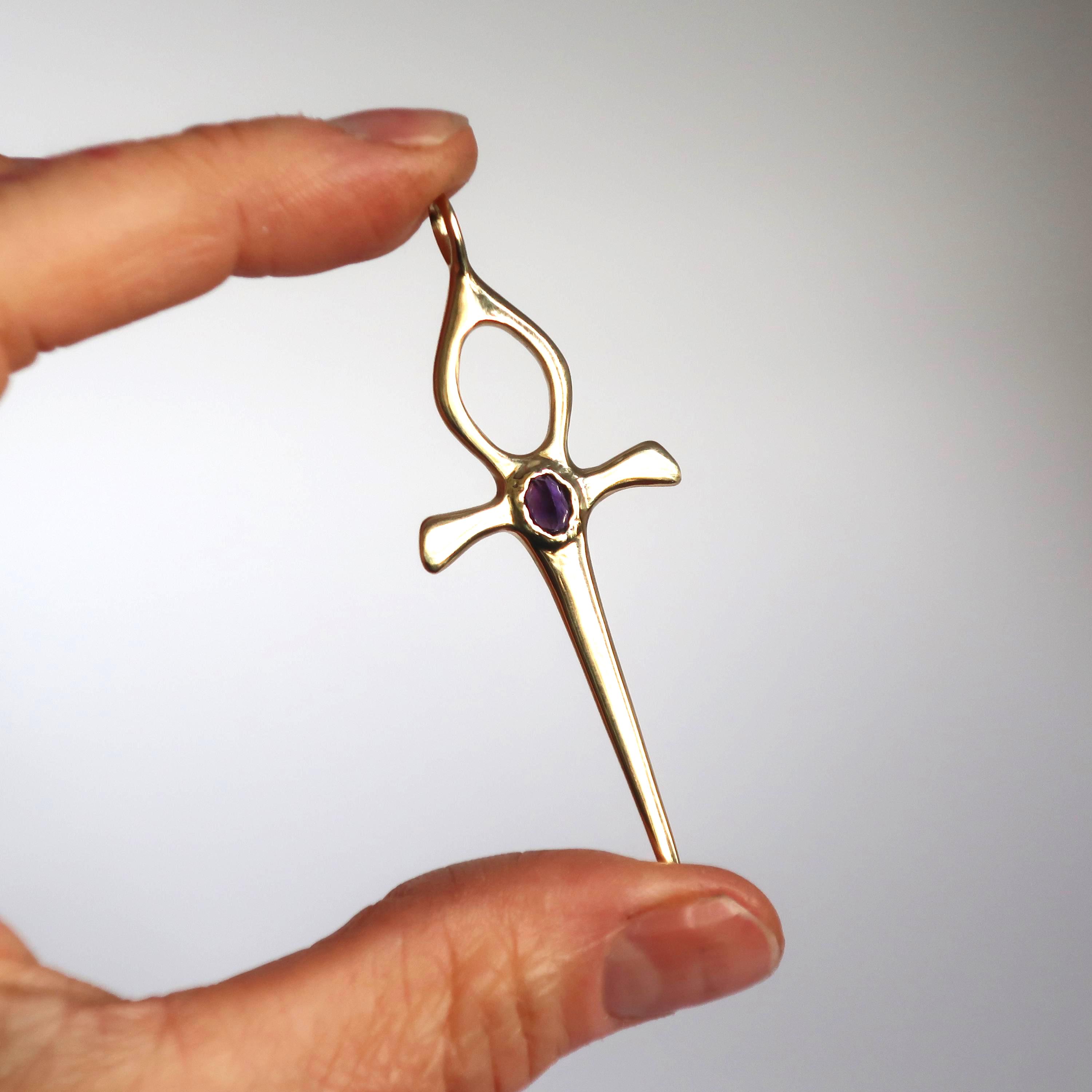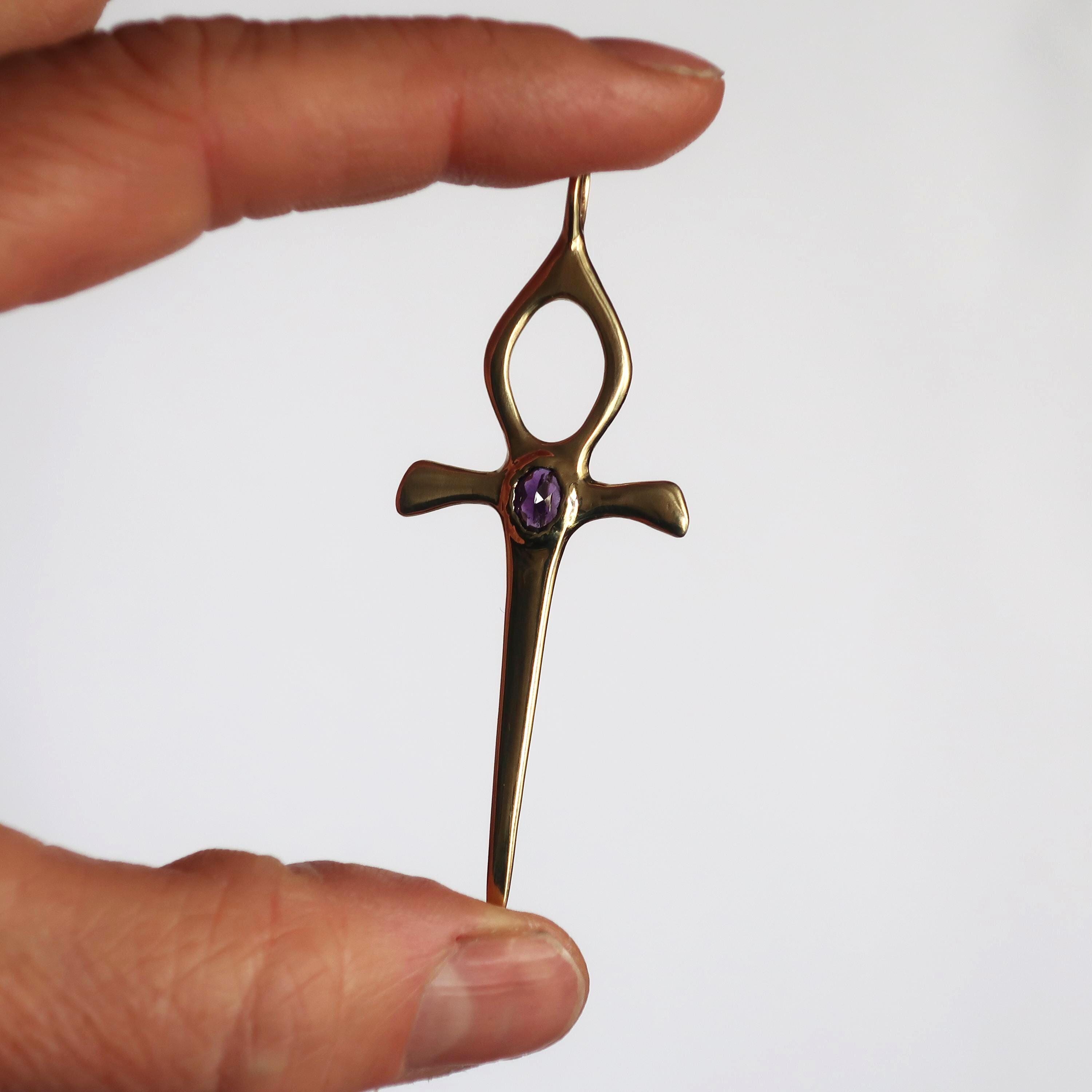 This Ankh Dagger is cast in solid brass and set with a genuine 5.5 x 4.5 mm faceted oval amethyst. The pendant measures 6.2 cm tall (including bail) x 2.4 cm wide and weighs approximately 4 grams.