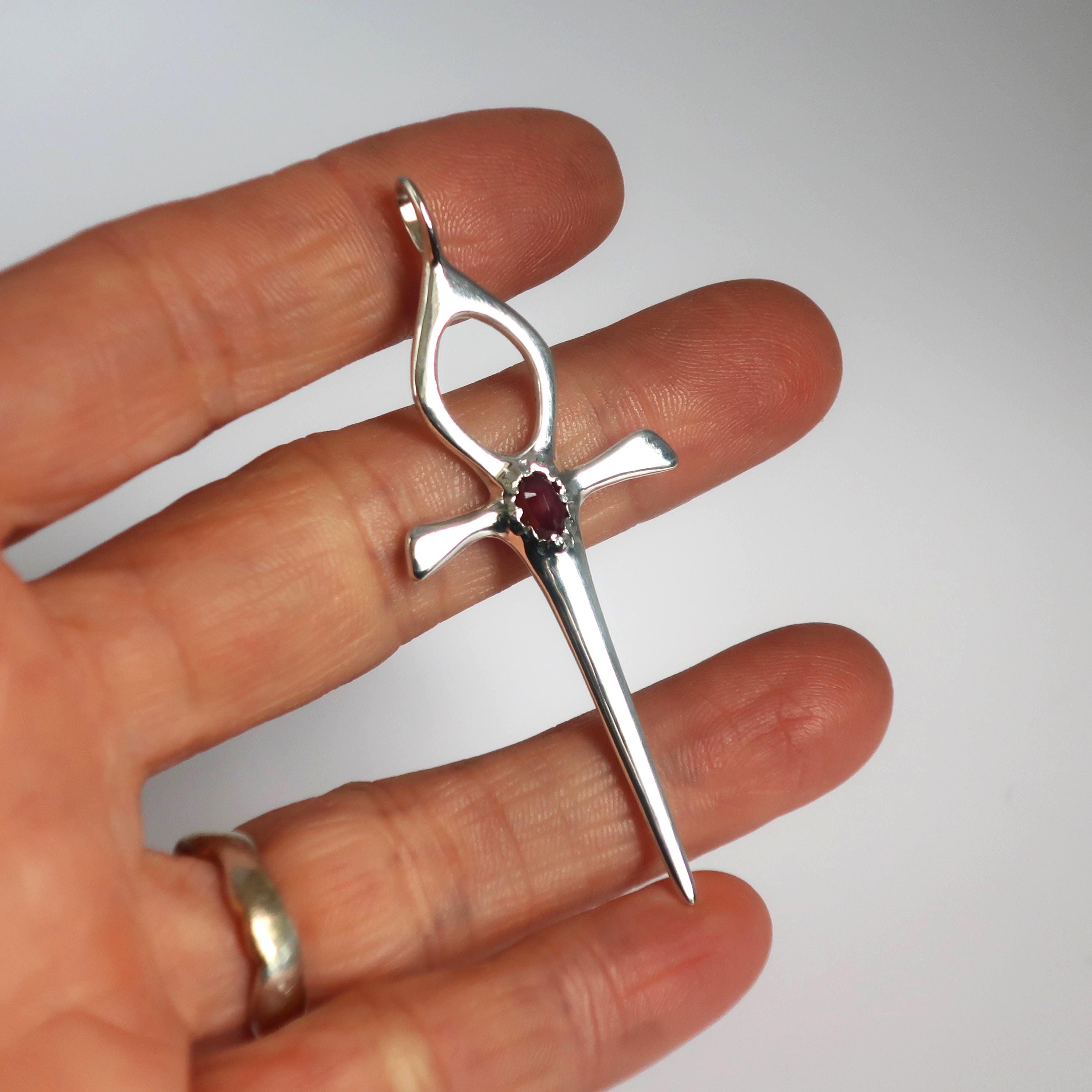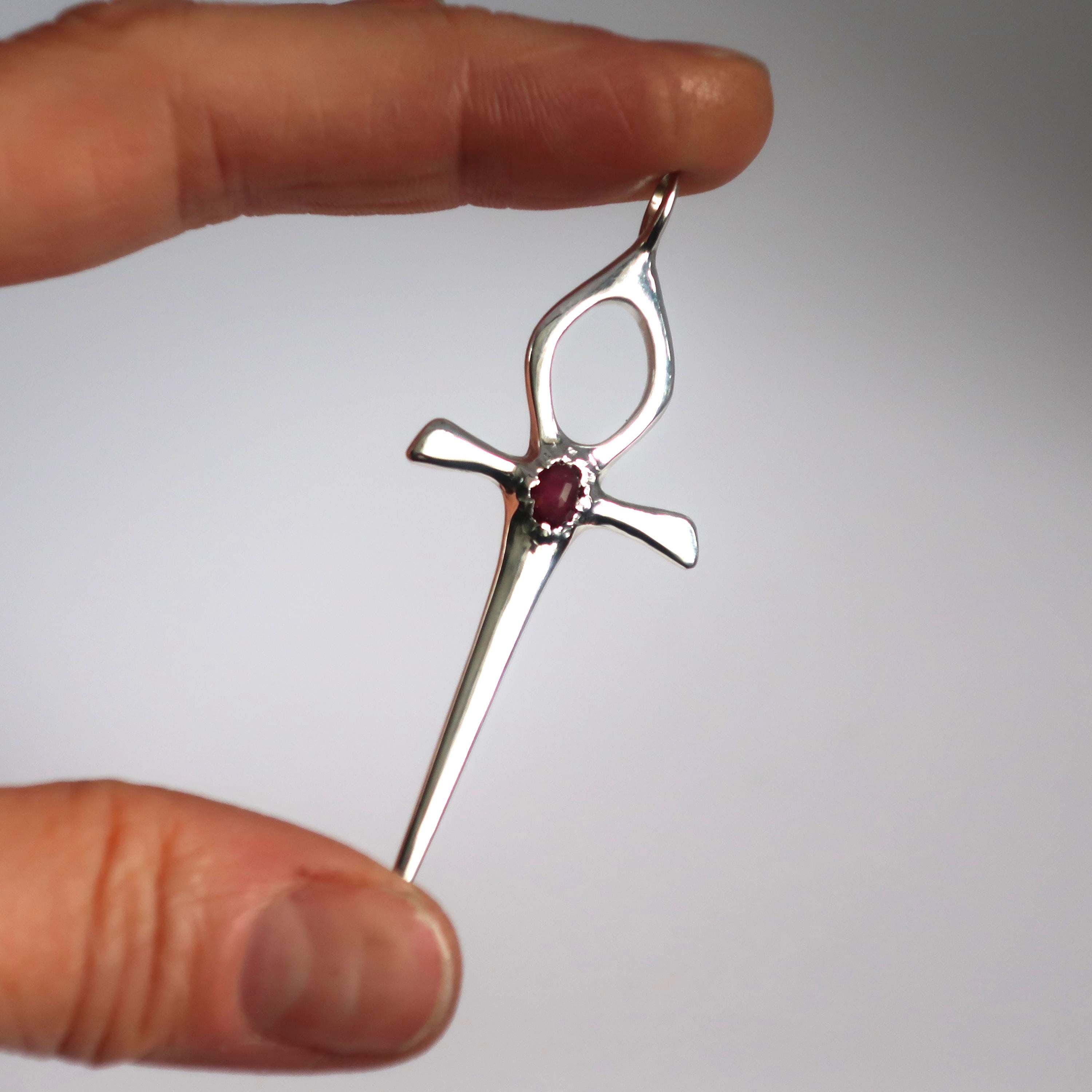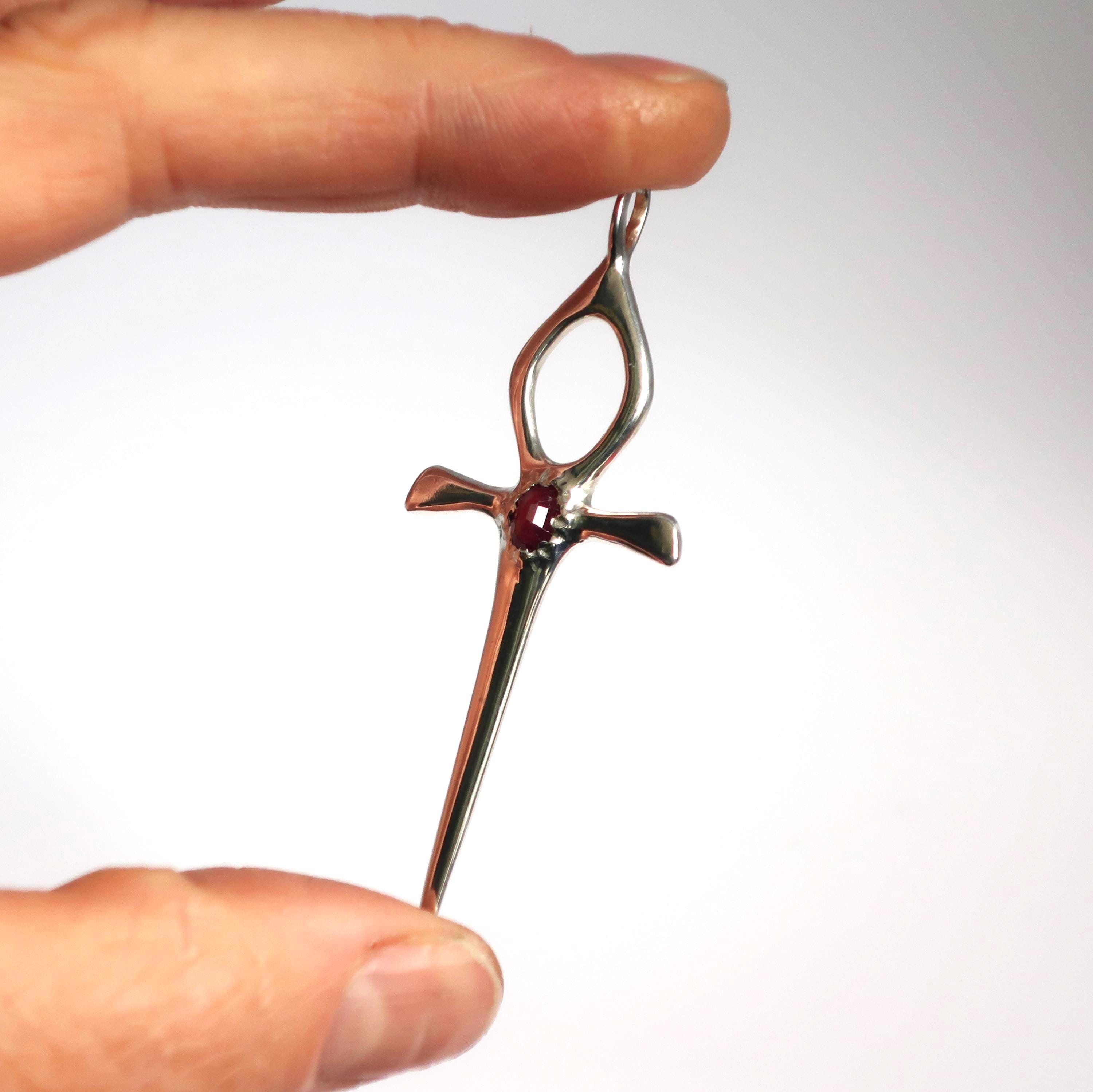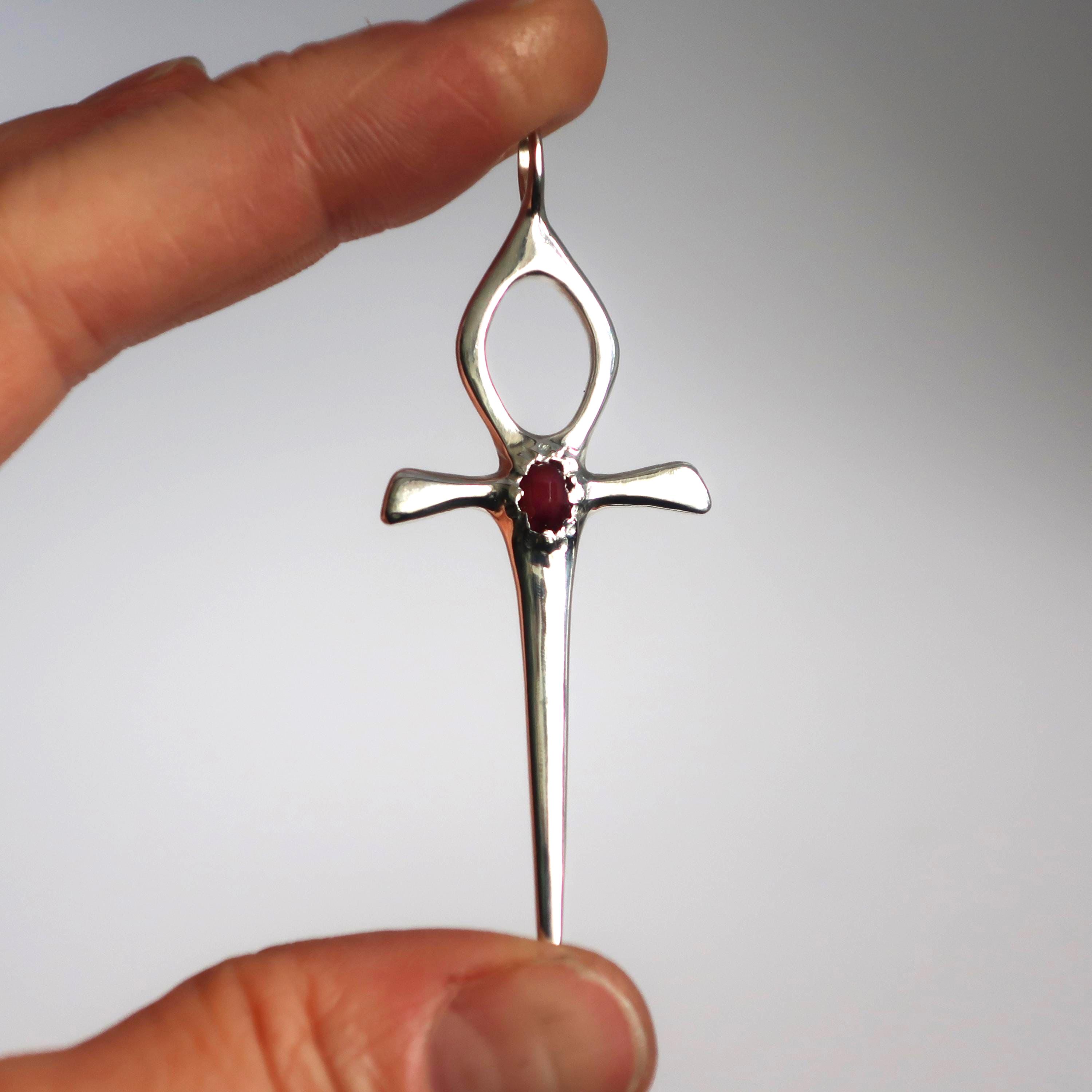 This Ankh Dagger is cast in solid Sterling Silver and set with a genuine 6mm x 4mm faceted deep red ruby. The pendant measures 6.2 cm tall (including bail) x 2.4 cm wide and weighs approximately 4.7 grams.