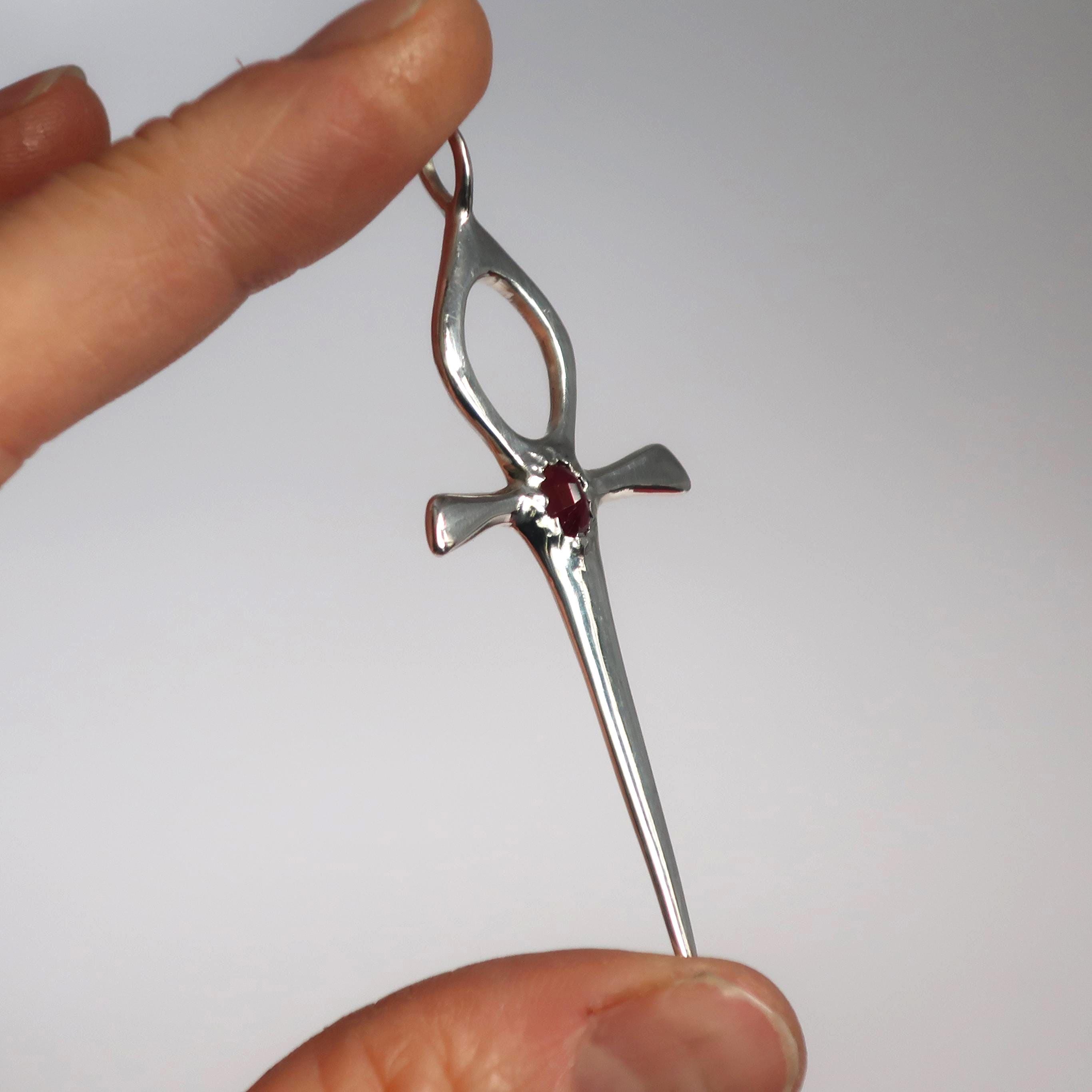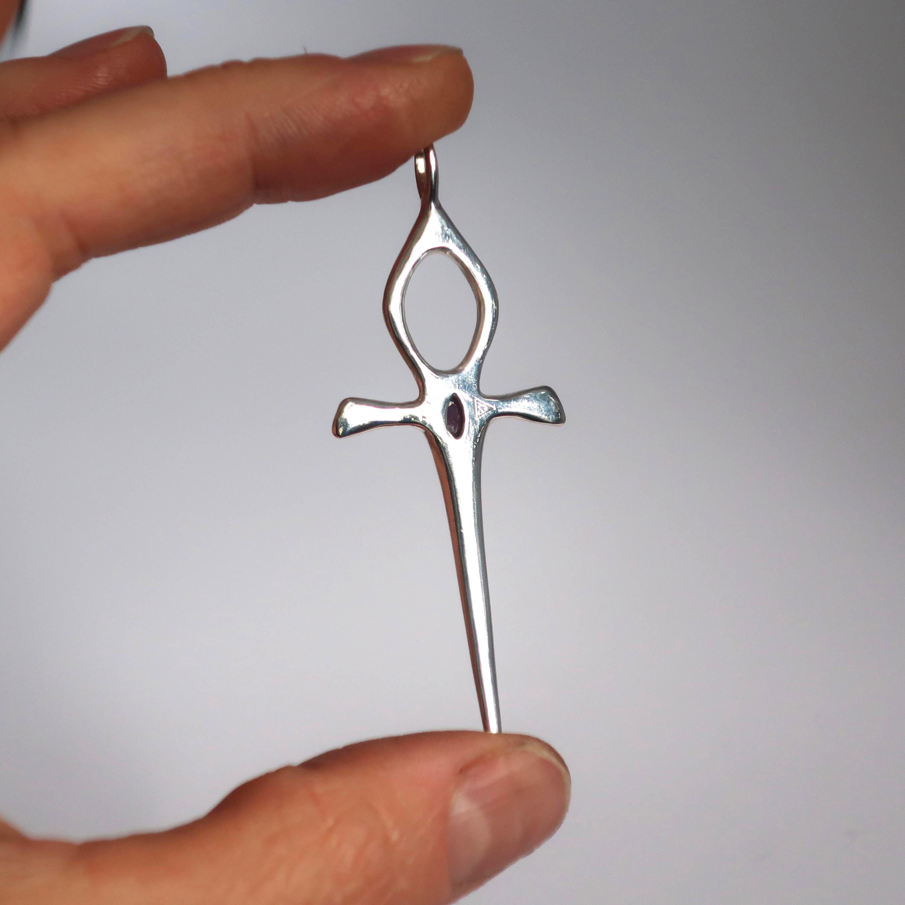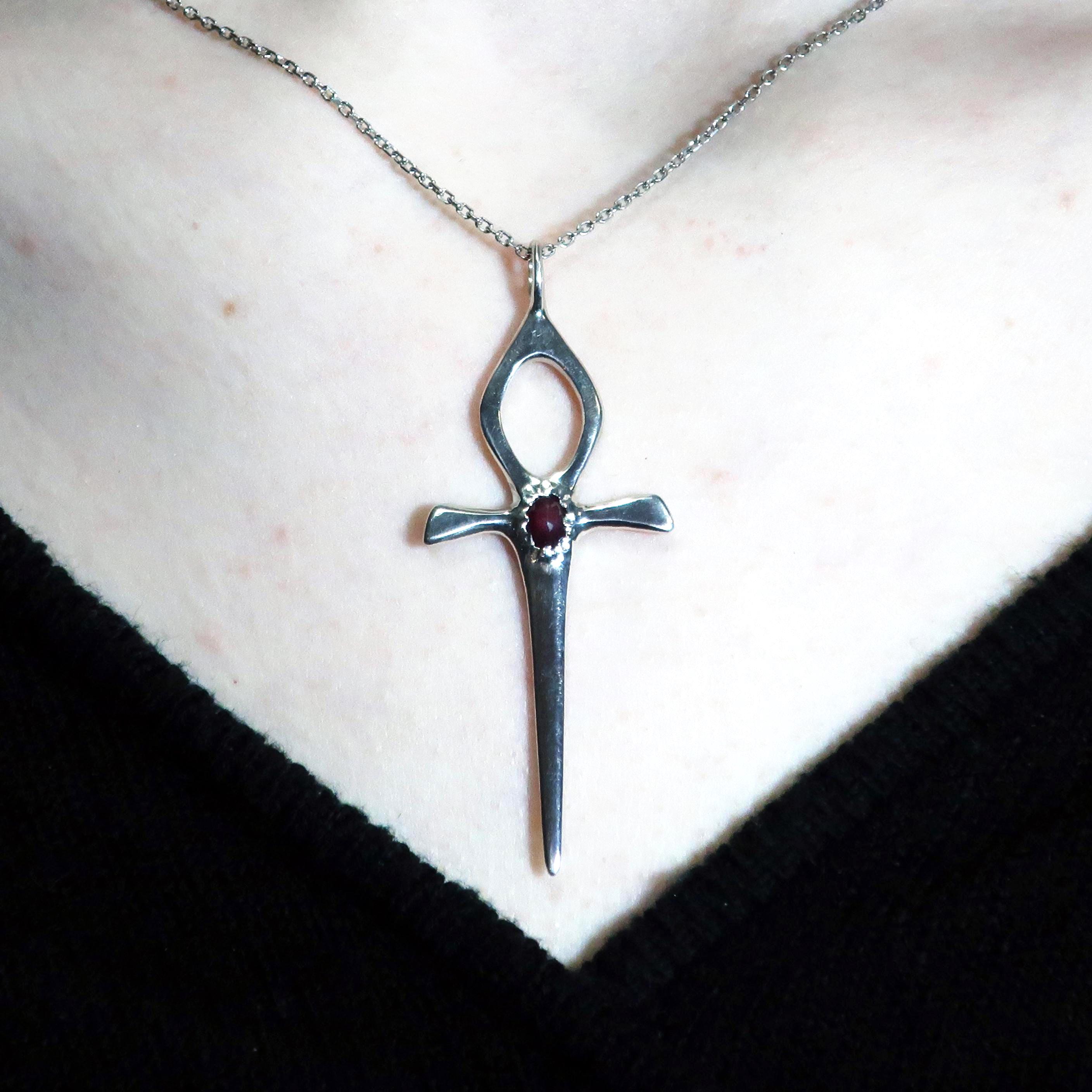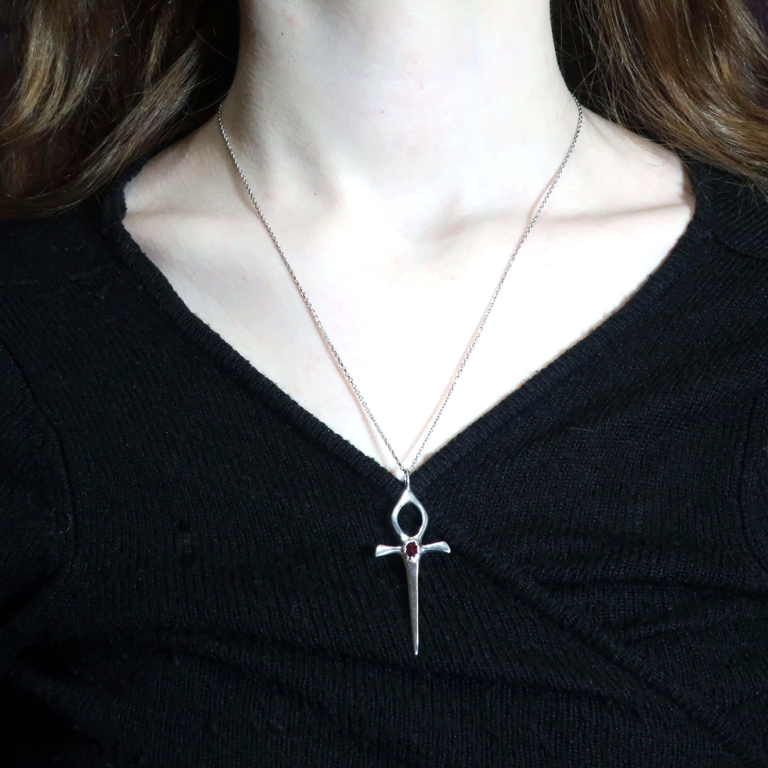 This Ankh Dagger is cast in solid Sterling Silver and set with a genuine 6mm x 4mm faceted deep red ruby. The pendant measures 6.2 cm tall (including bail) x 2.4 cm wide and weighs approximately 4.7 grams.