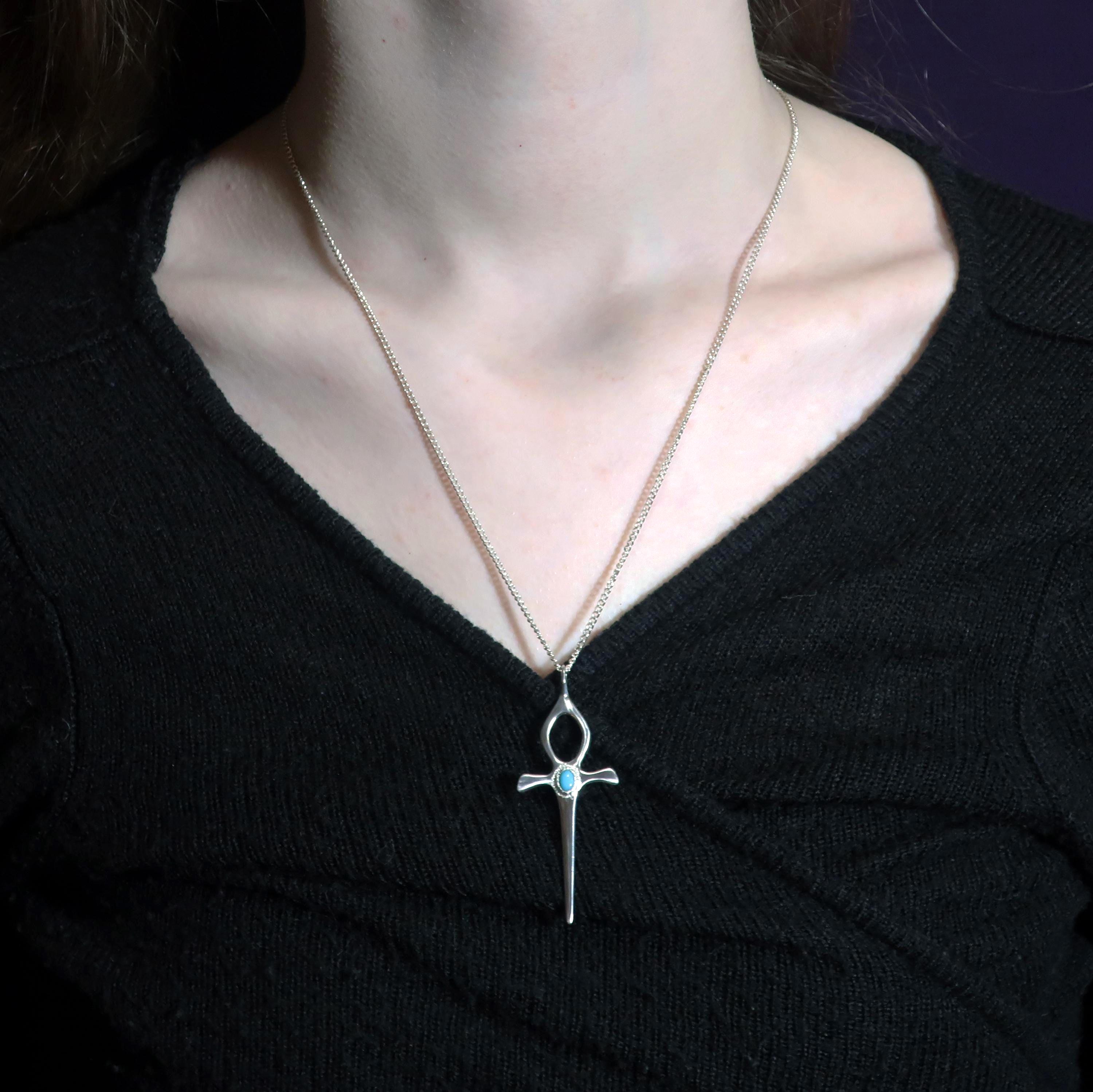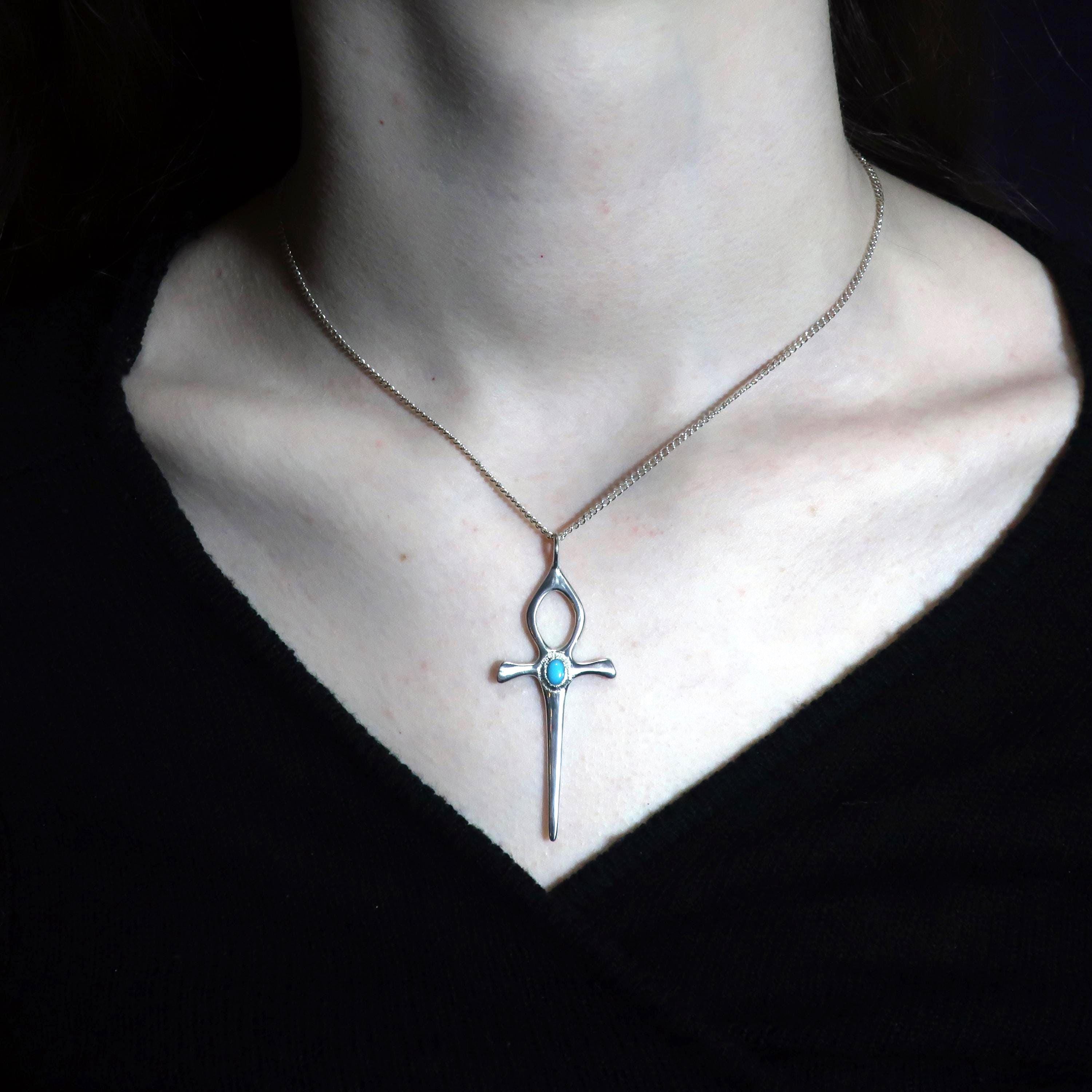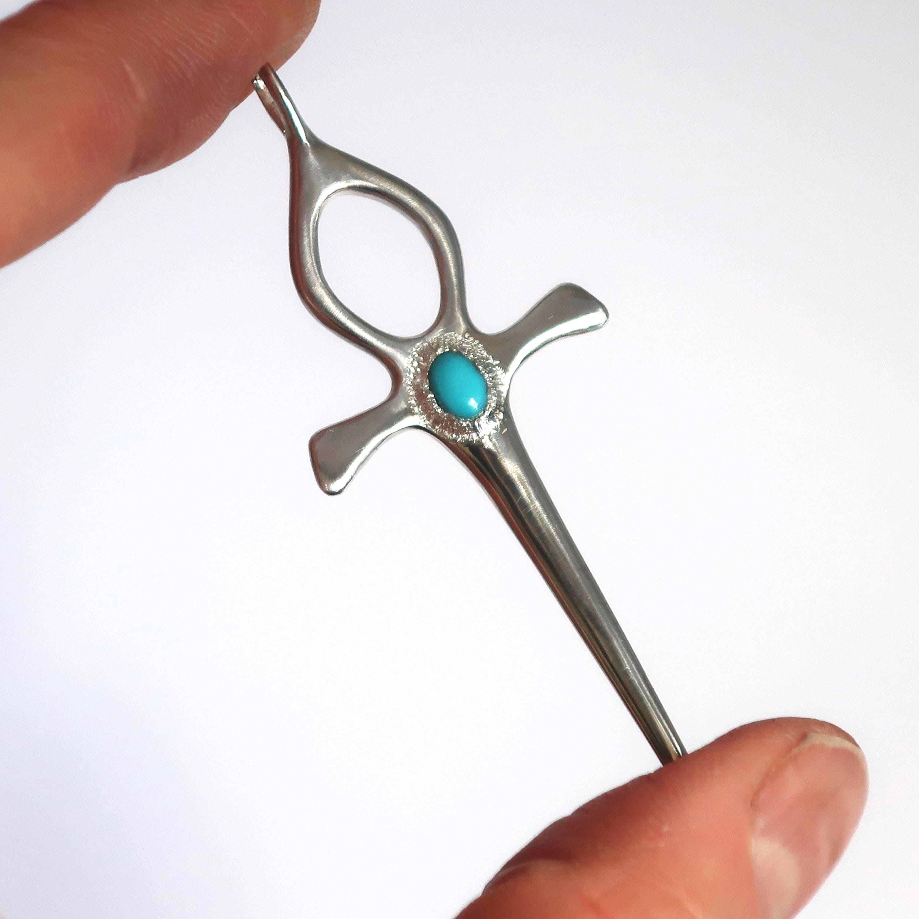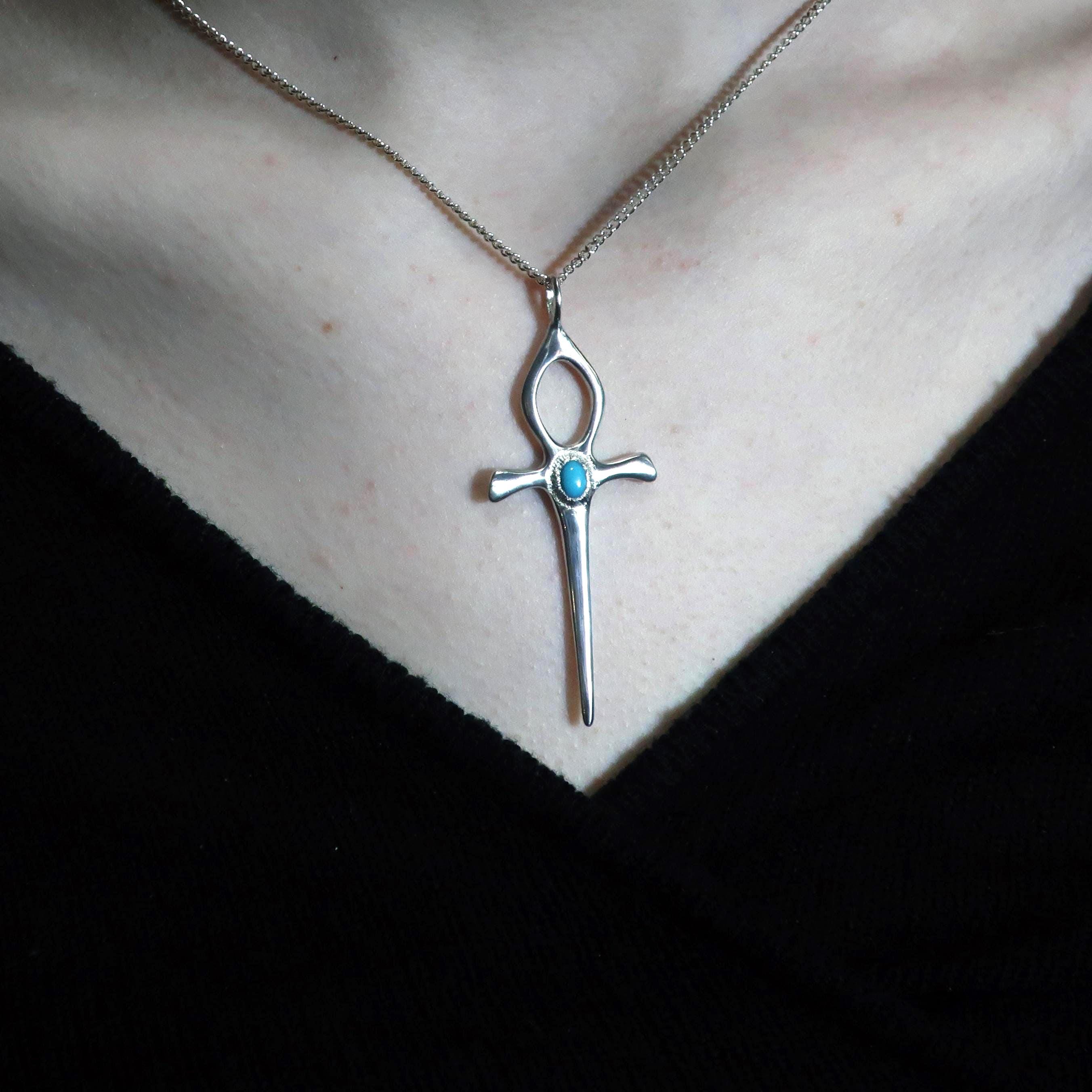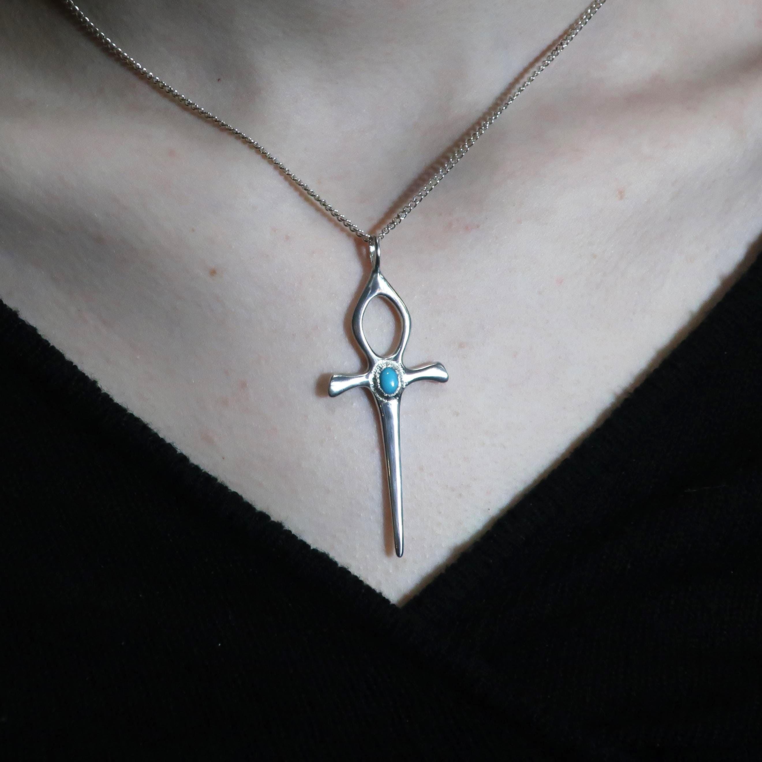 This Ankh Dagger is cast in solid Sterling Silver and set with a genuine 6mm x 4mm American mined, Arizona turquoise cabochon. The pendant measures 6.2 cm tall (including bail) x 2.4 cm wide and weighs approximately 4.5 grams.