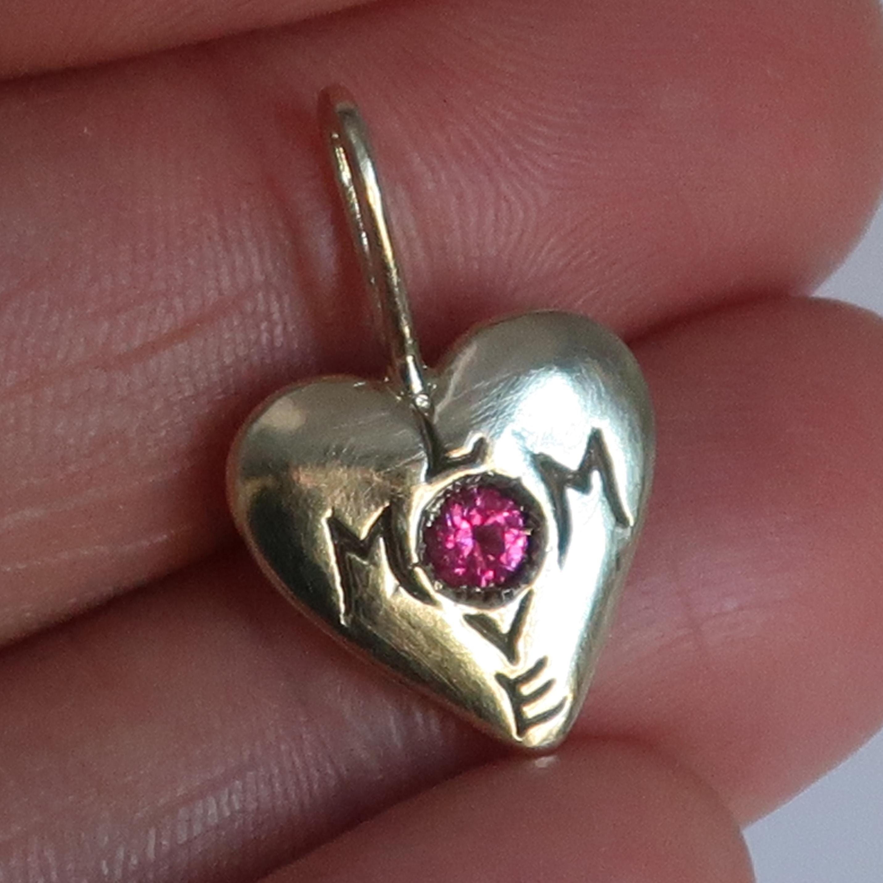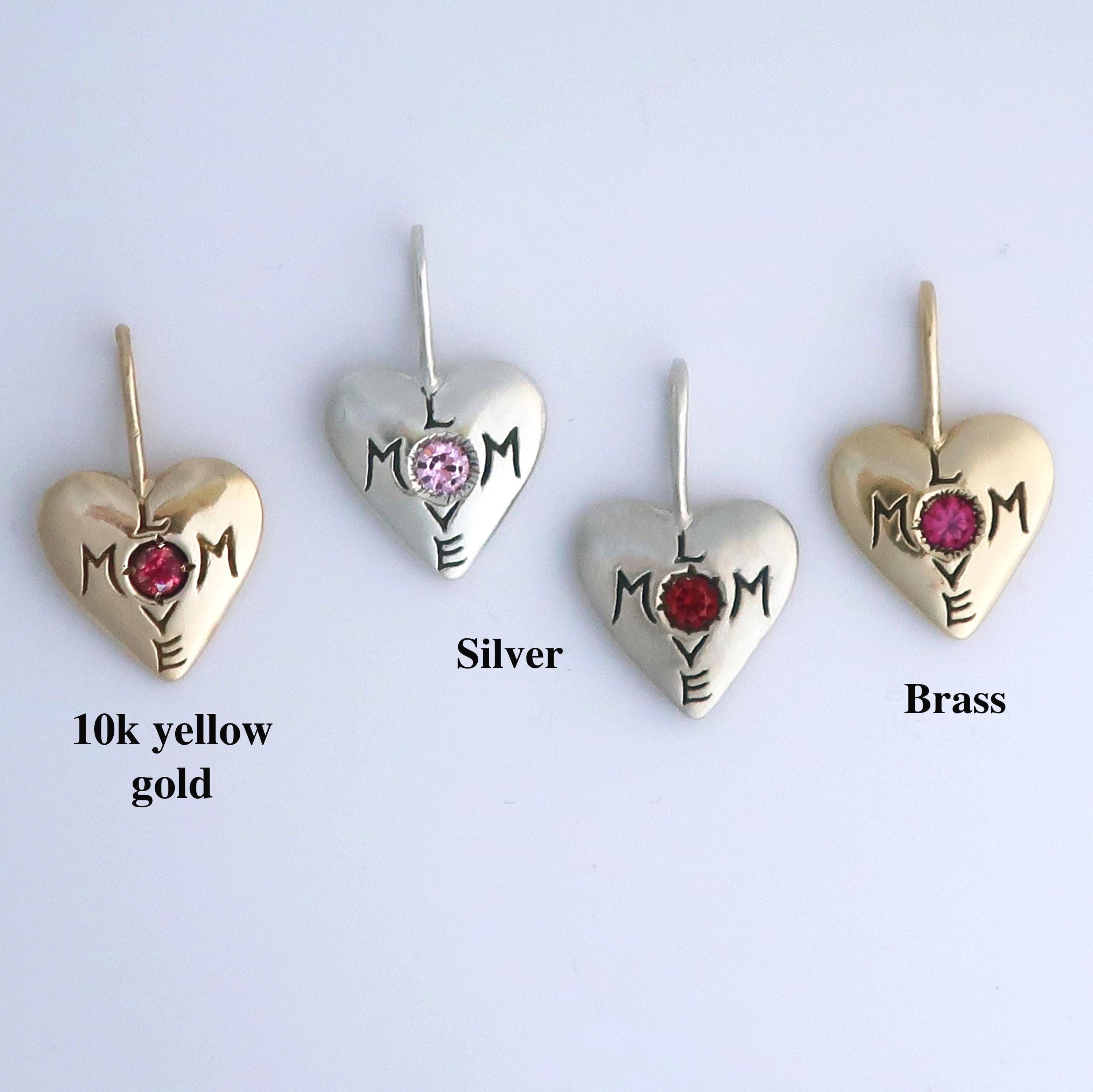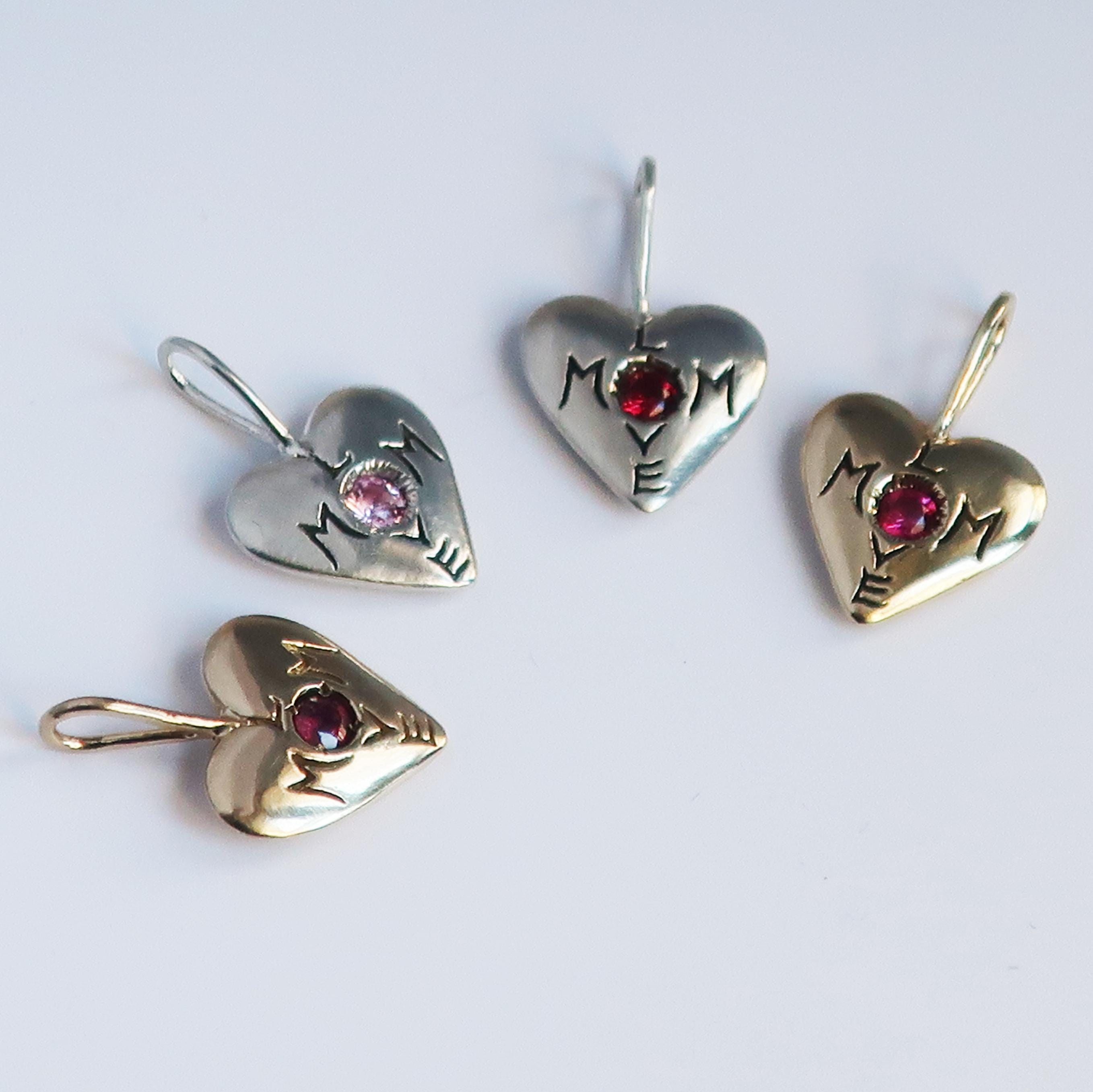 "Mom Love" Charm cast in your choice of solid 10k Yellow Gold set with a genuine pink tourmaline, solid Sterling Silver set with a lab-made pale pink sapphire or red ruby, or brass set with lab-made vibrant pink sapphire.