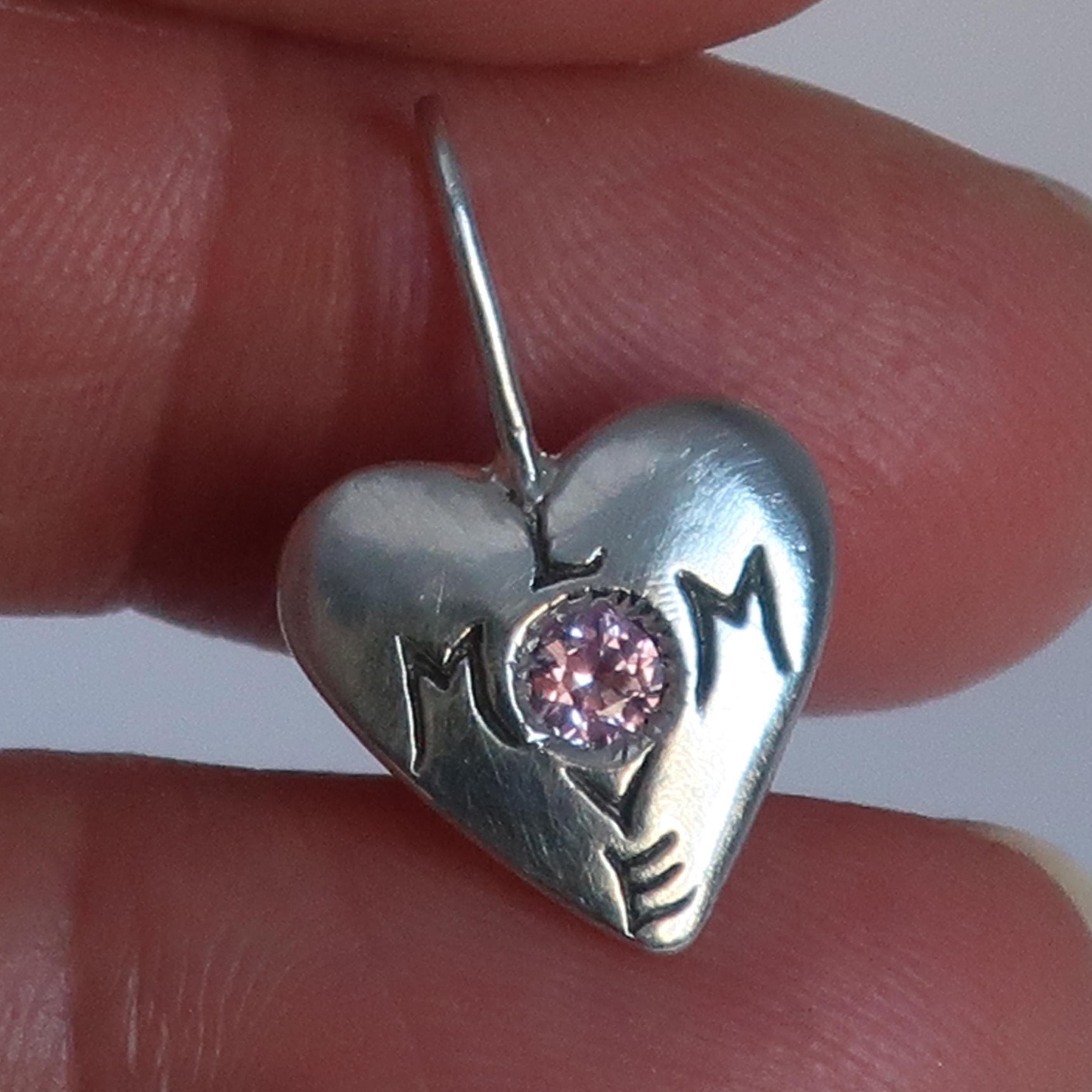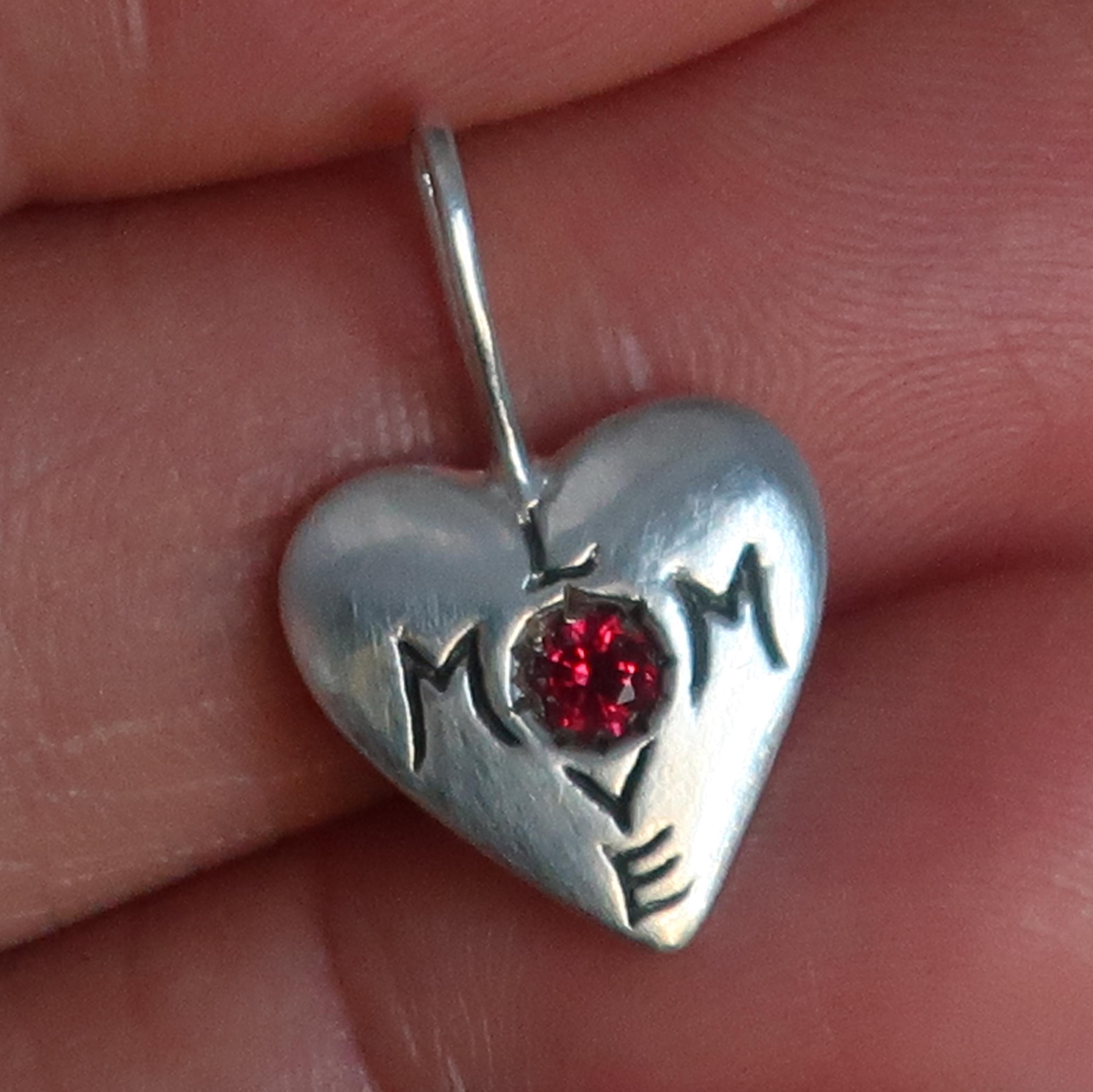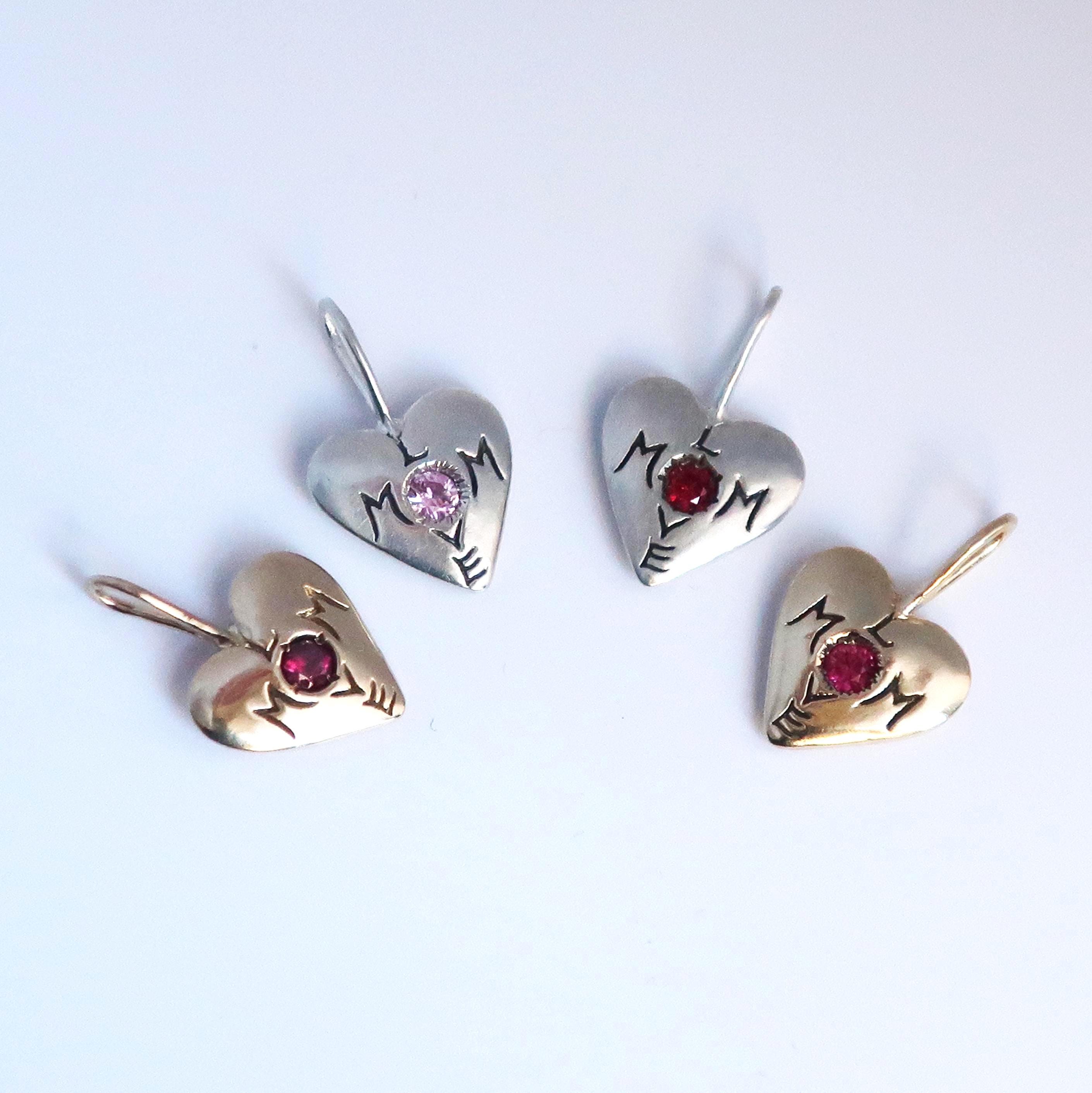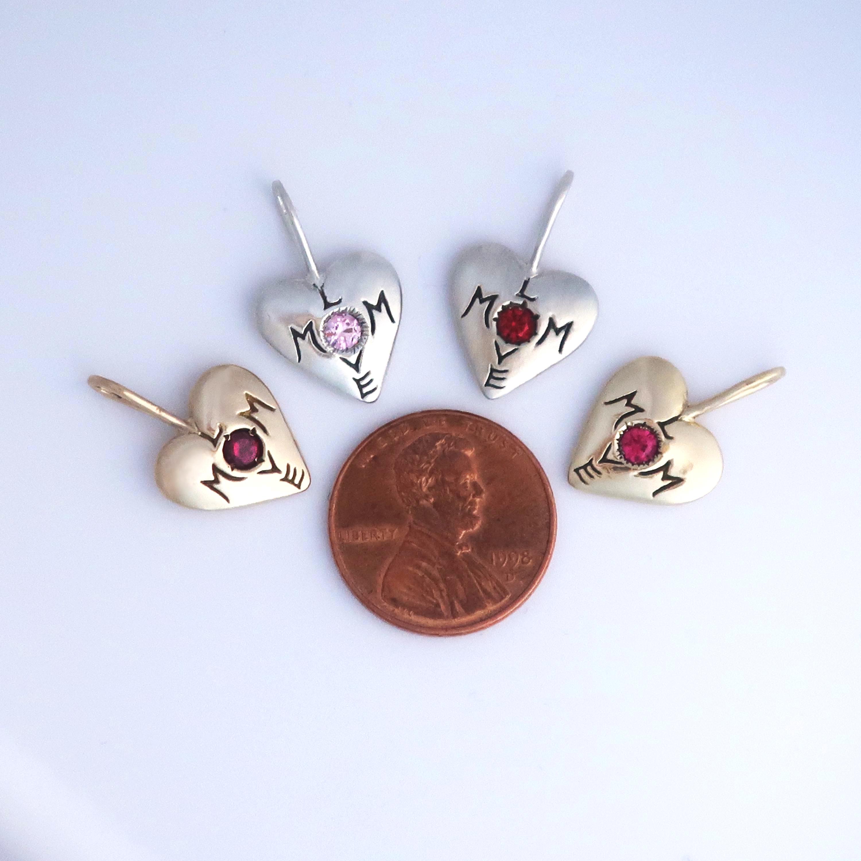 "Mom Love" Charm cast in your choice of solid 10k Yellow Gold set with a genuine pink tourmaline, solid Sterling Silver set with a lab-made pale pink sapphire or red ruby, or brass set with lab-made vibrant pink sapphire.