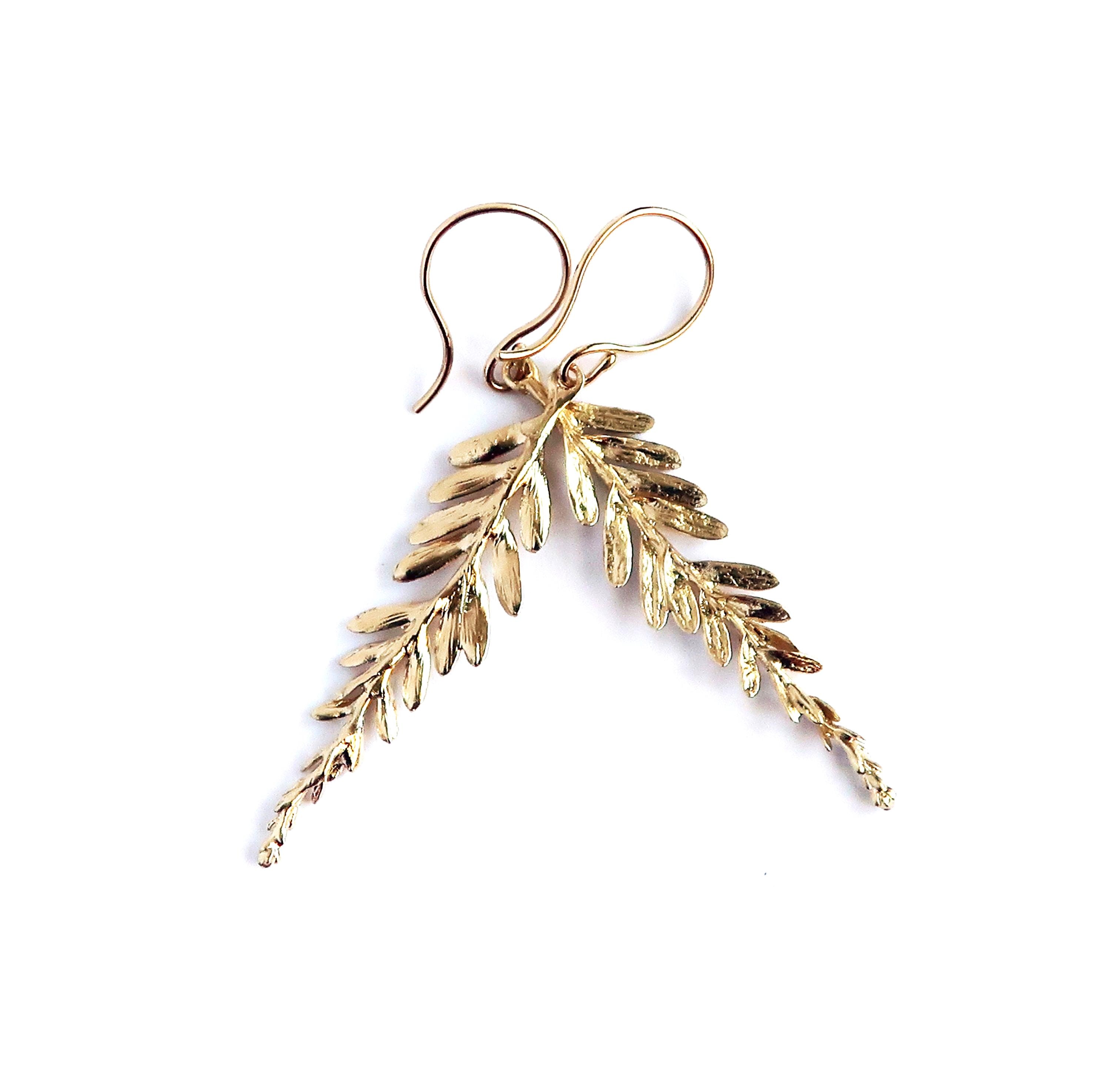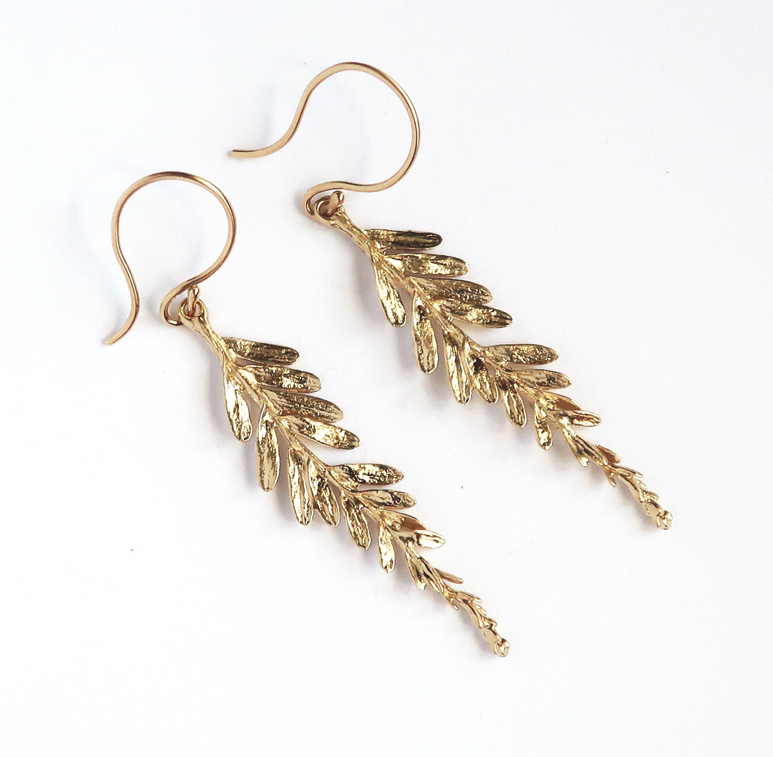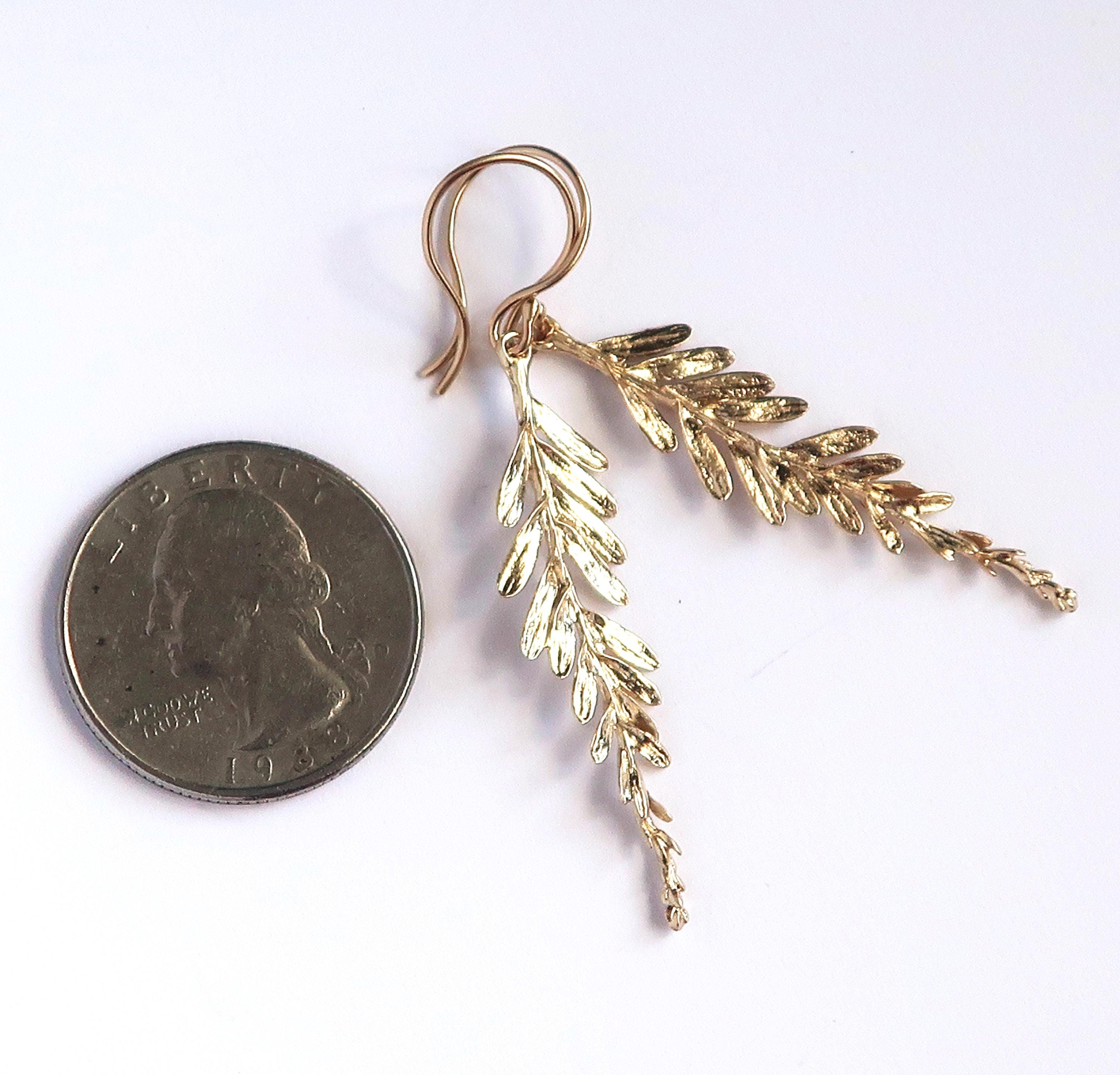 The delicate branch measures 4.1 cm long (including the hanger the length of the earring is 5.6 cm) and approximately 9 mm wide (at the widest part). The dangling part is cast in brass and the hand made ear wire are 14/20 gold filled wire.