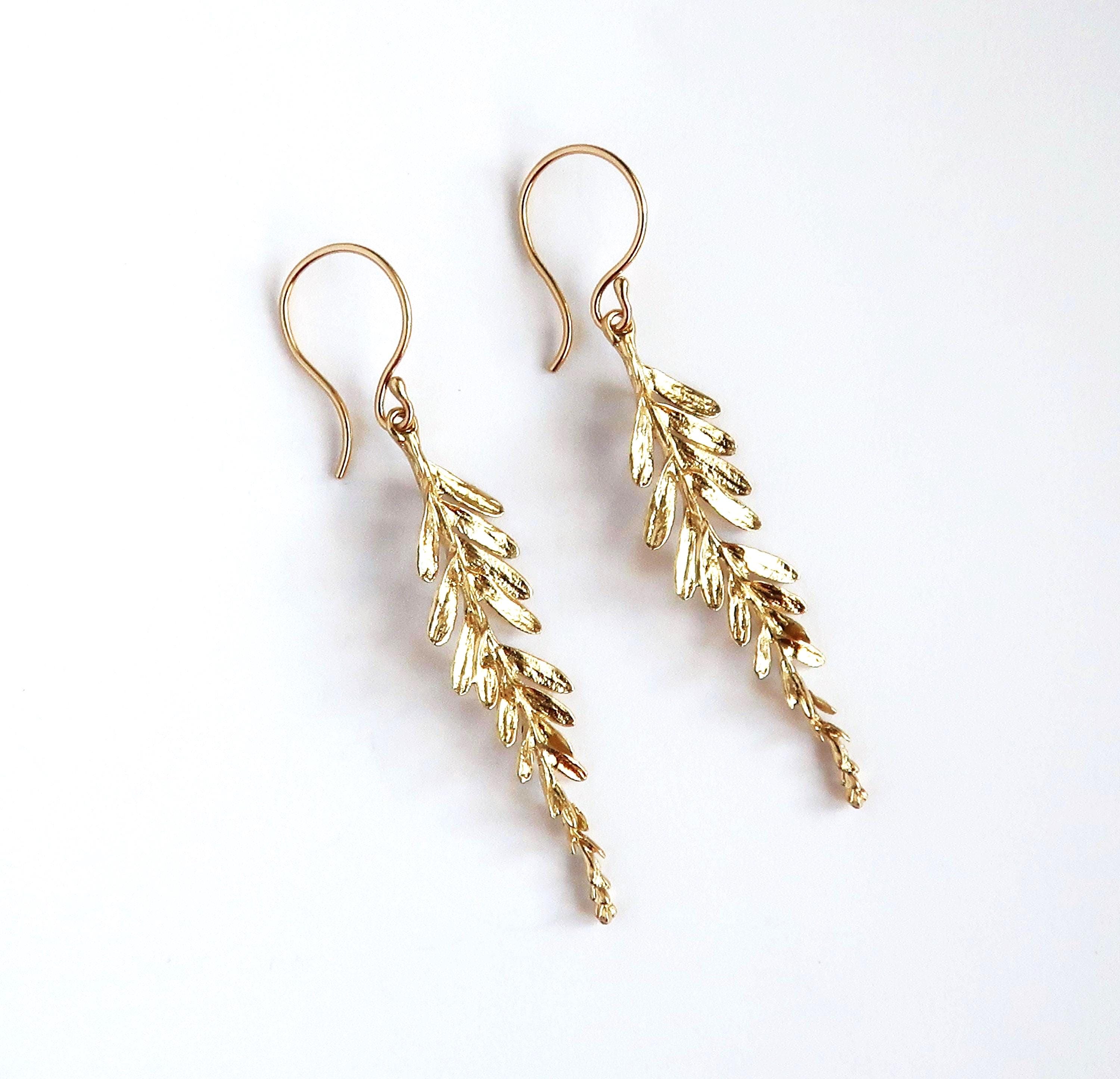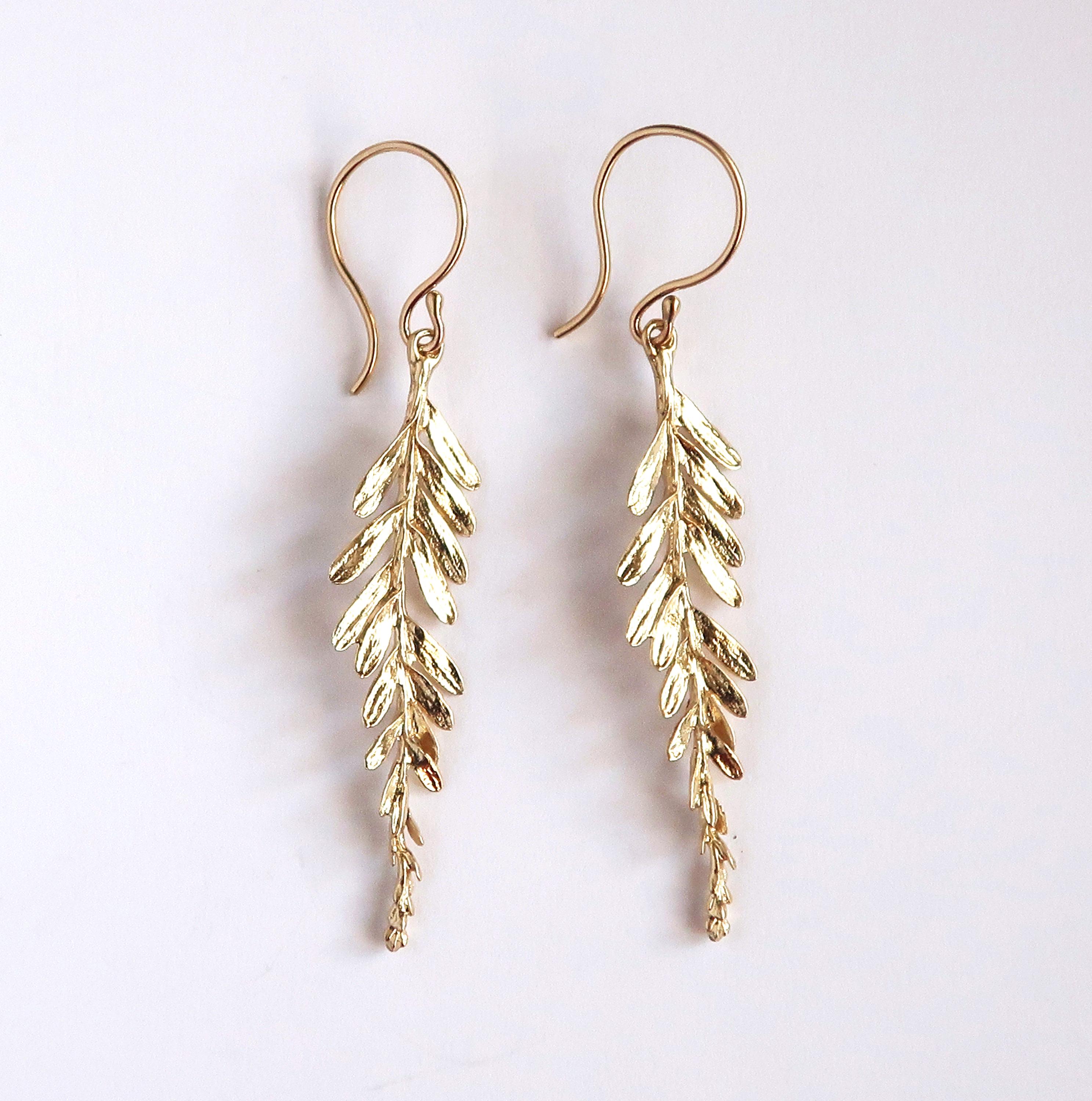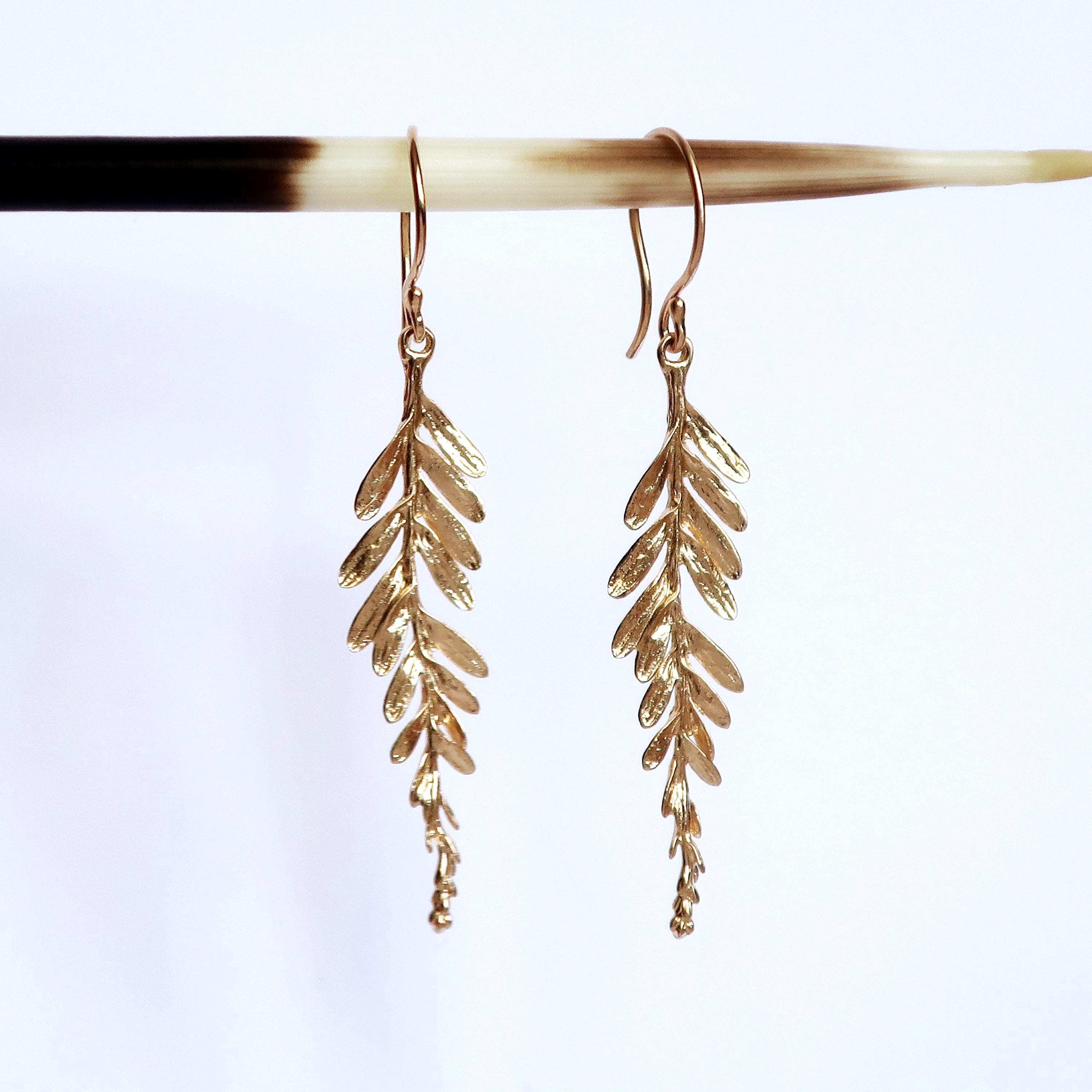 The delicate branch measures 4.1 cm long (including the hanger the length of the earring is 5.6 cm) and approximately 9 mm wide (at the widest part). The dangling part is cast in brass and the hand made ear wire are 14/20 gold filled wire.