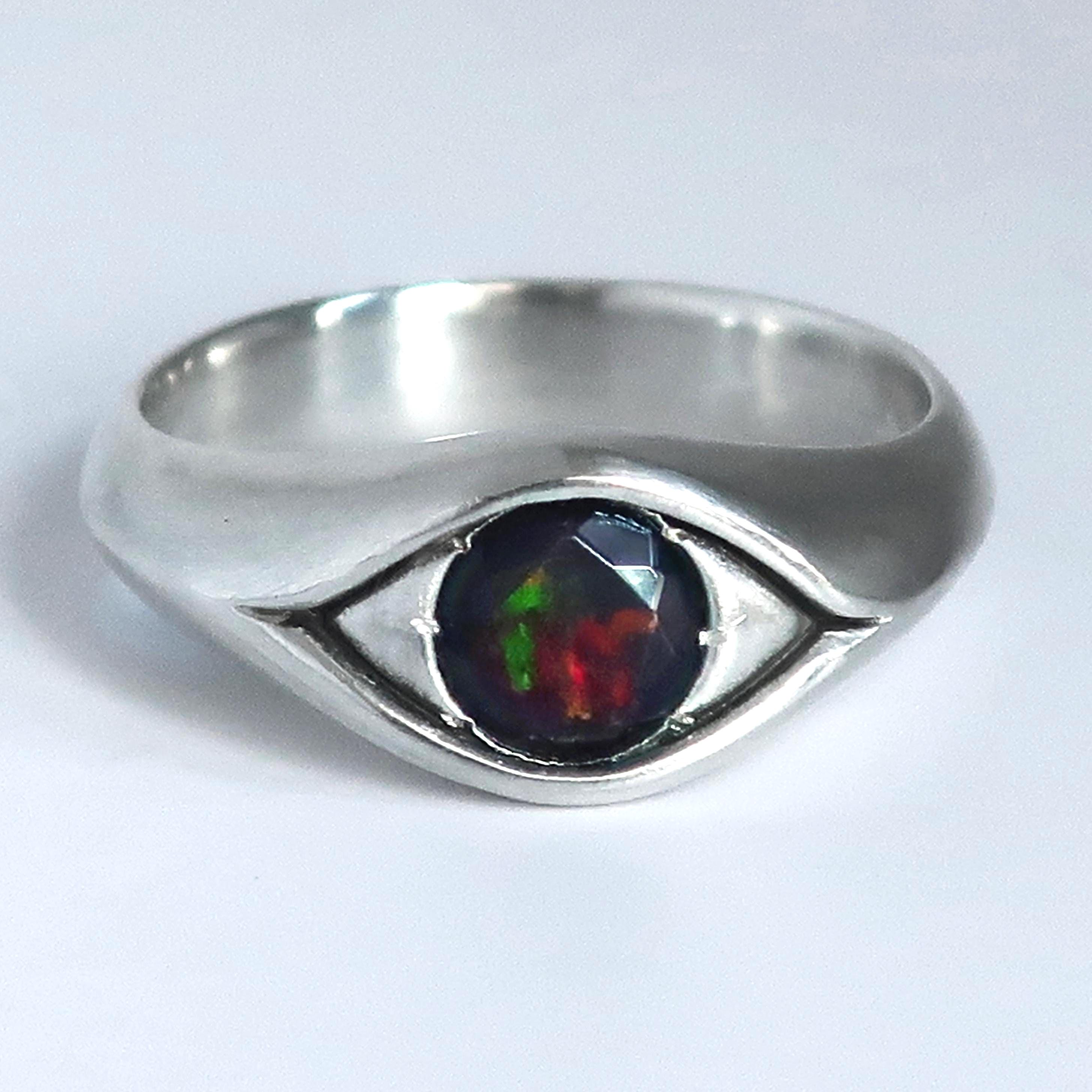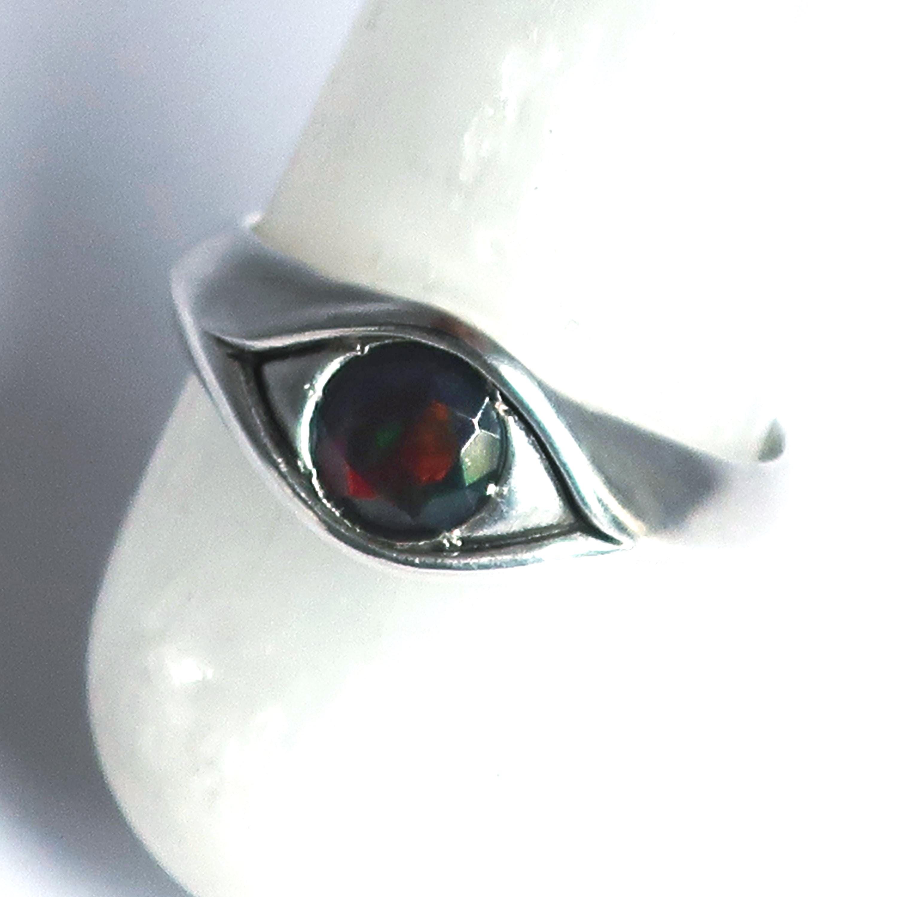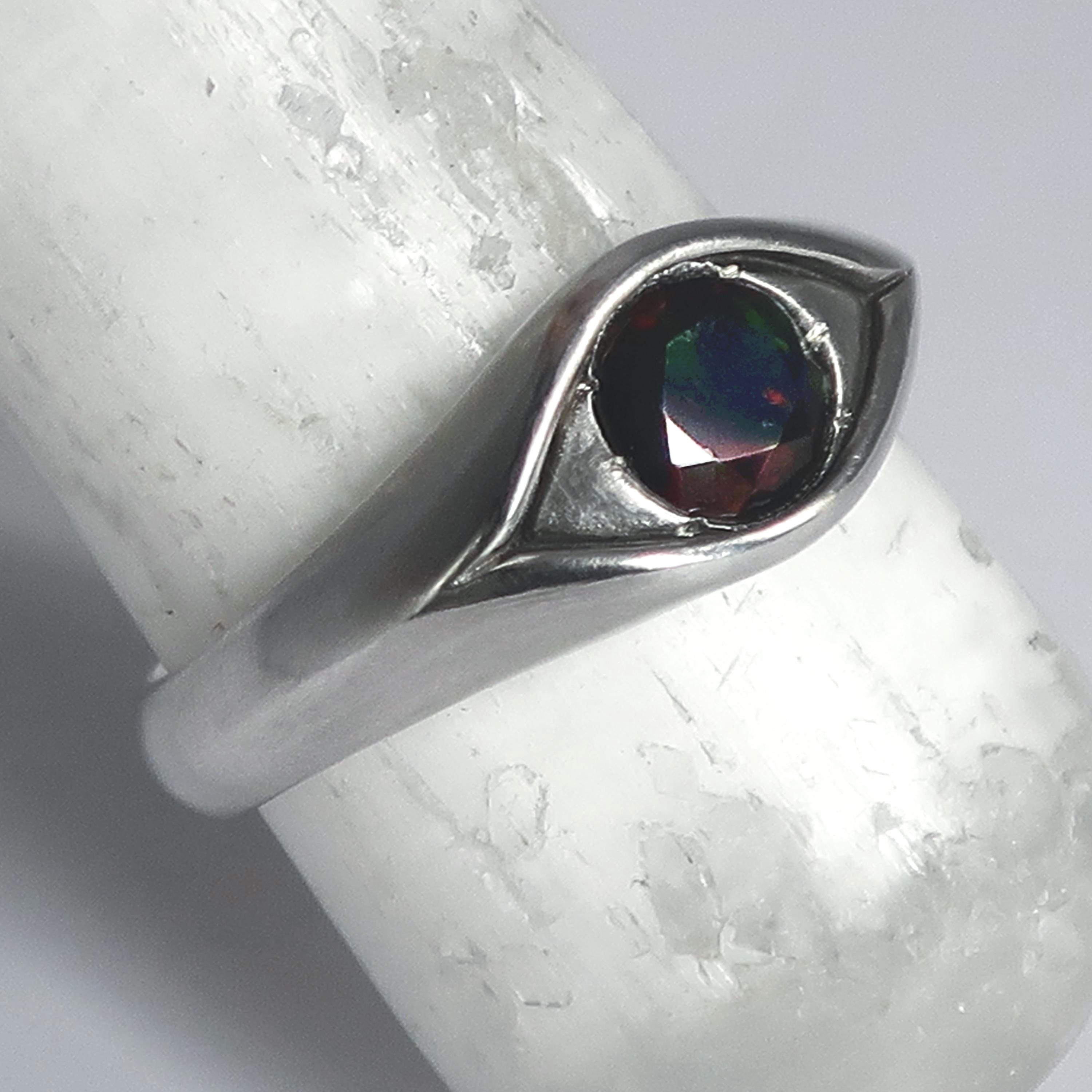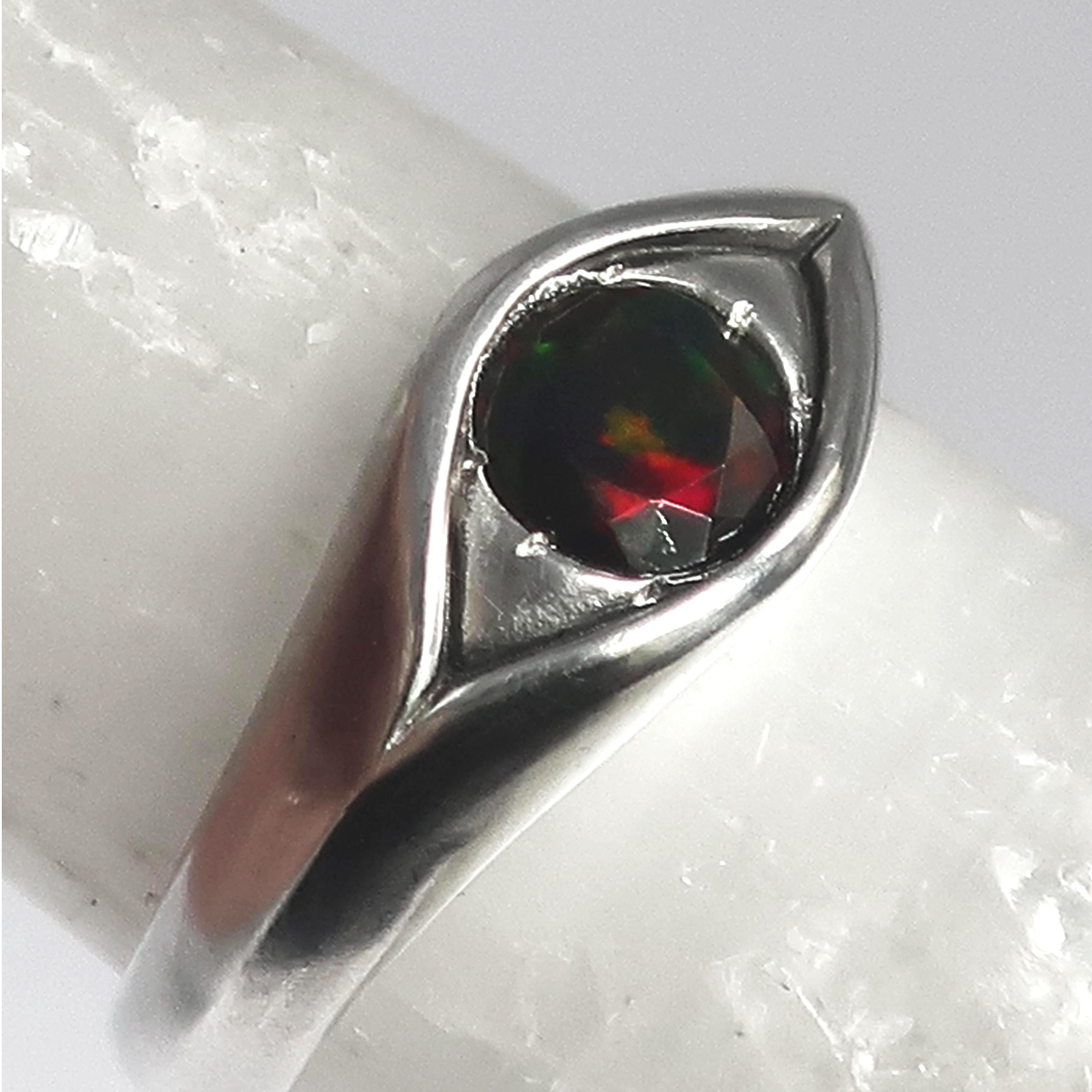 This magical eye ring is solid cast Sterling Silver. The focal point is a beautiful 6mm faceted black opal that flashes with red, green & yellow fire. Brushed and buffed to a satiny glow, this ring is US size 8. Looks stunning on its own but can be stacked with other rings as well.