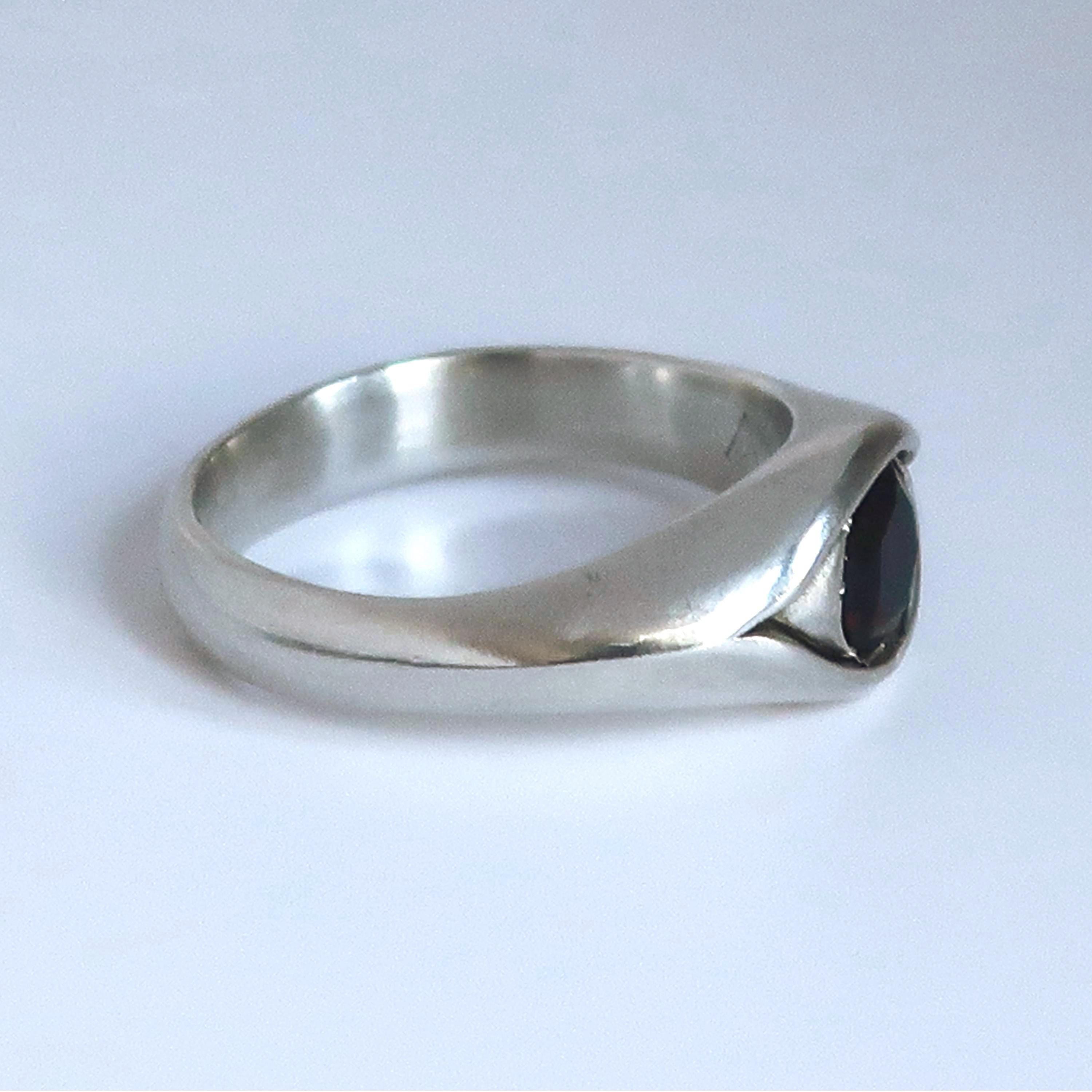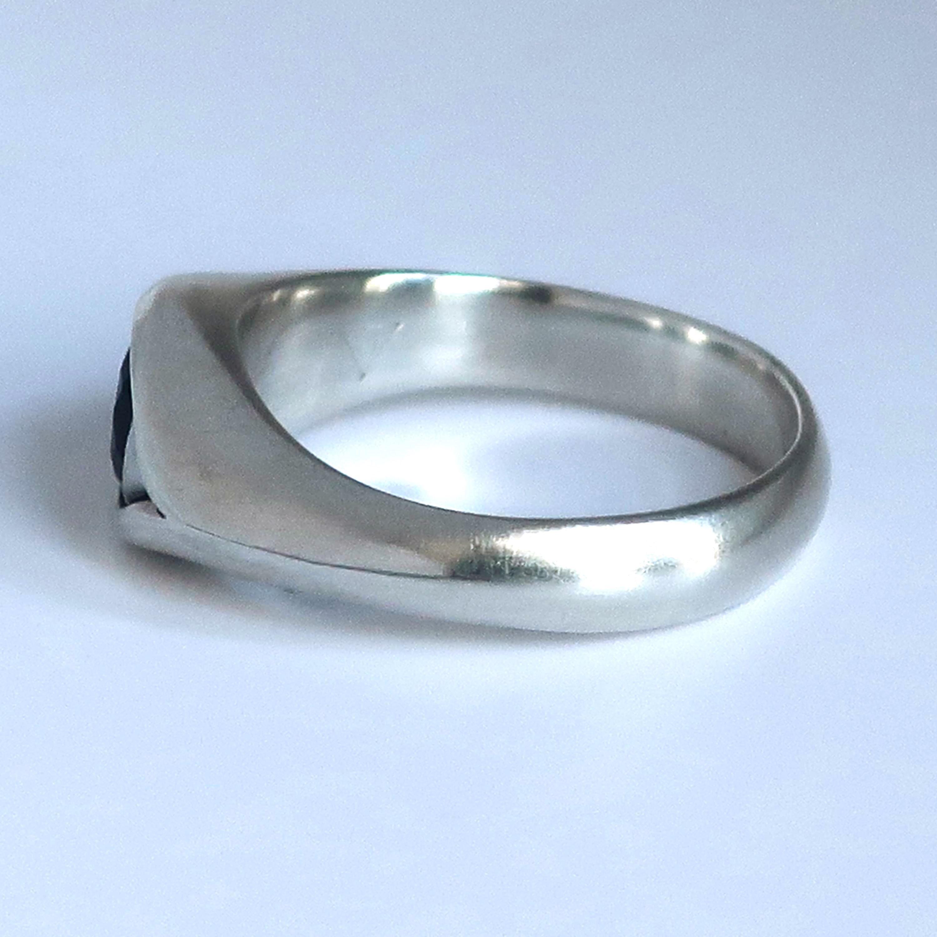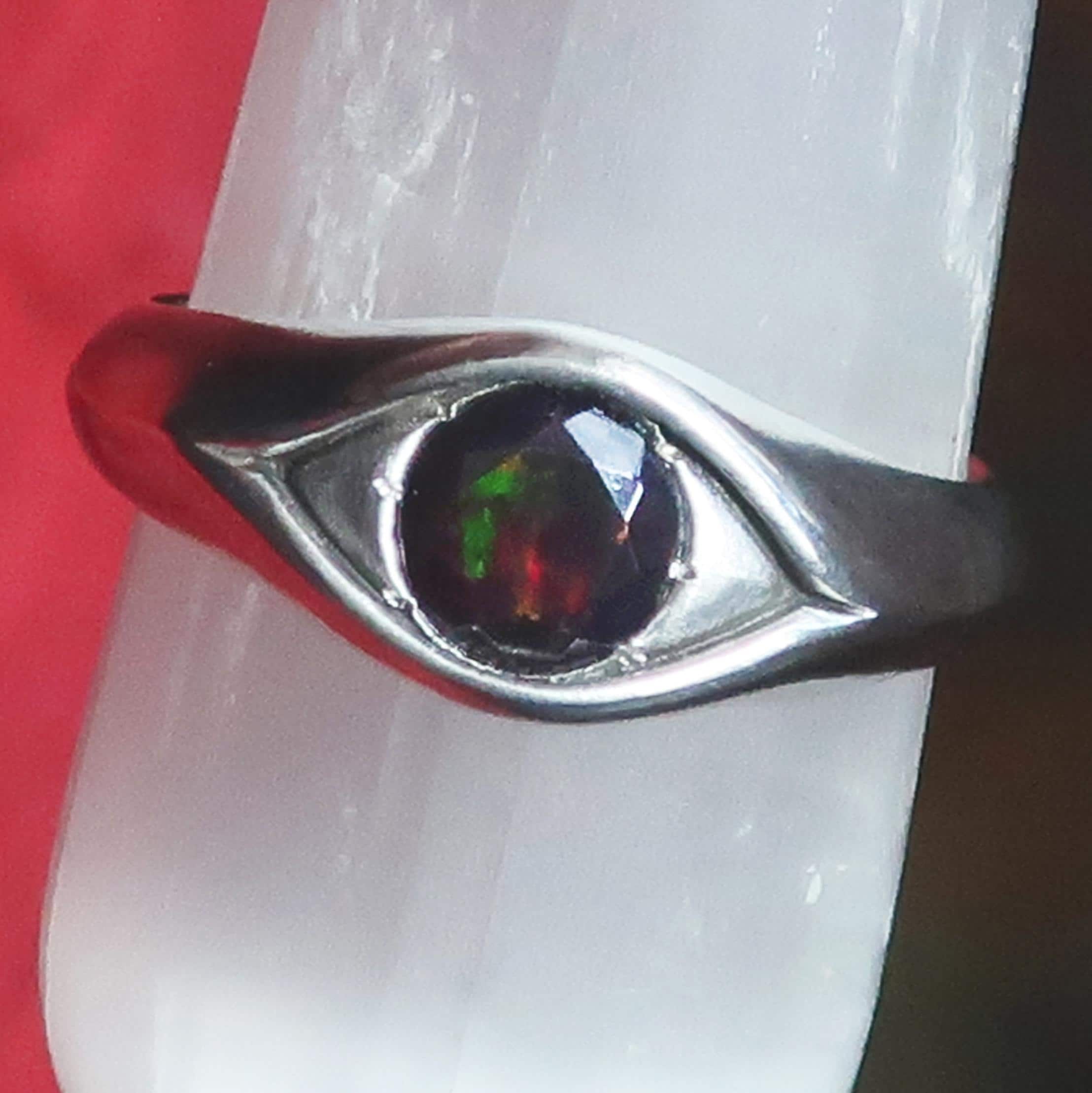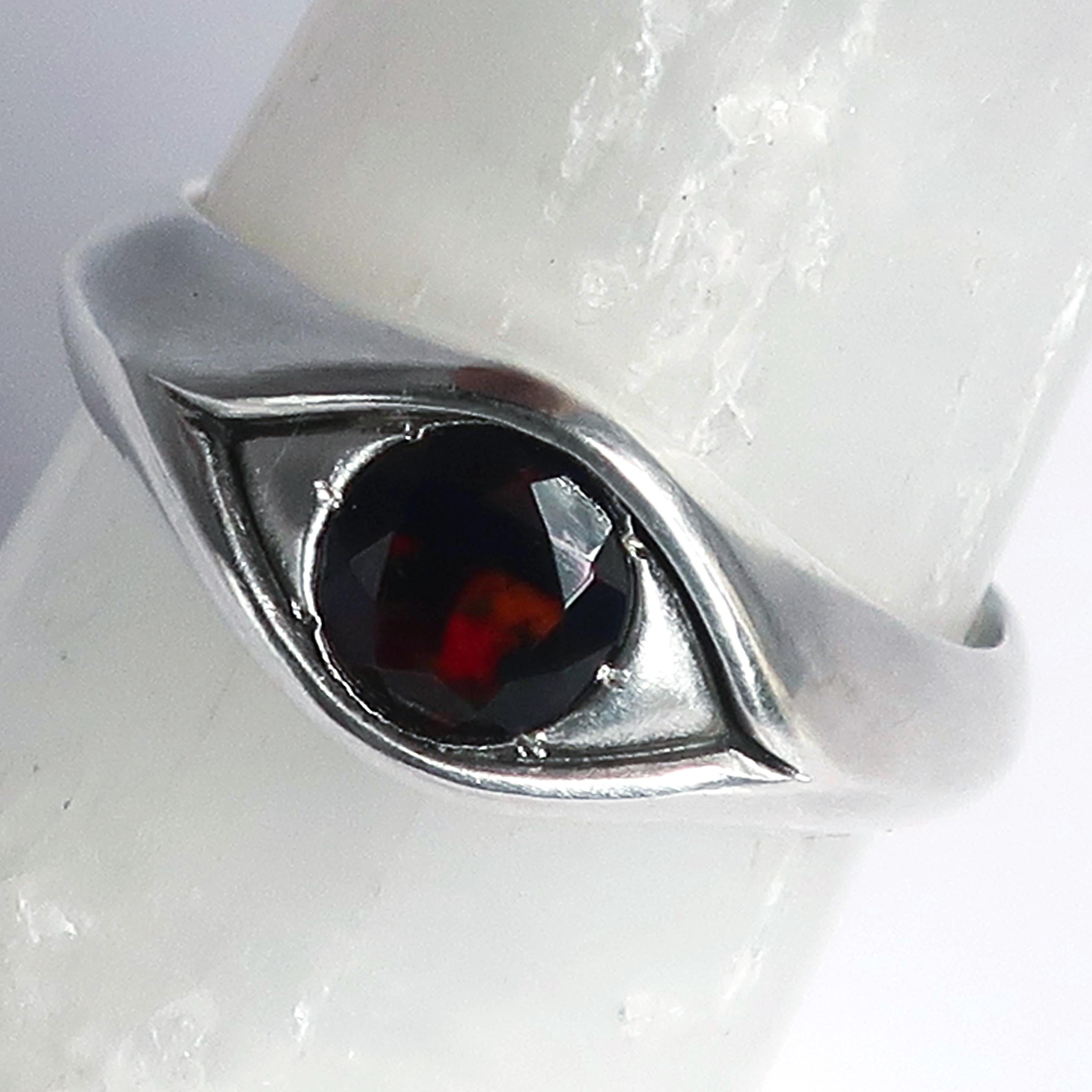 This magical eye ring is solid cast Sterling Silver. The focal point is a beautiful 6mm faceted black opal that flashes with red, green & yellow fire. Brushed and buffed to a satiny glow, this ring is US size 8. Looks stunning on its own but can be stacked with other rings as well.