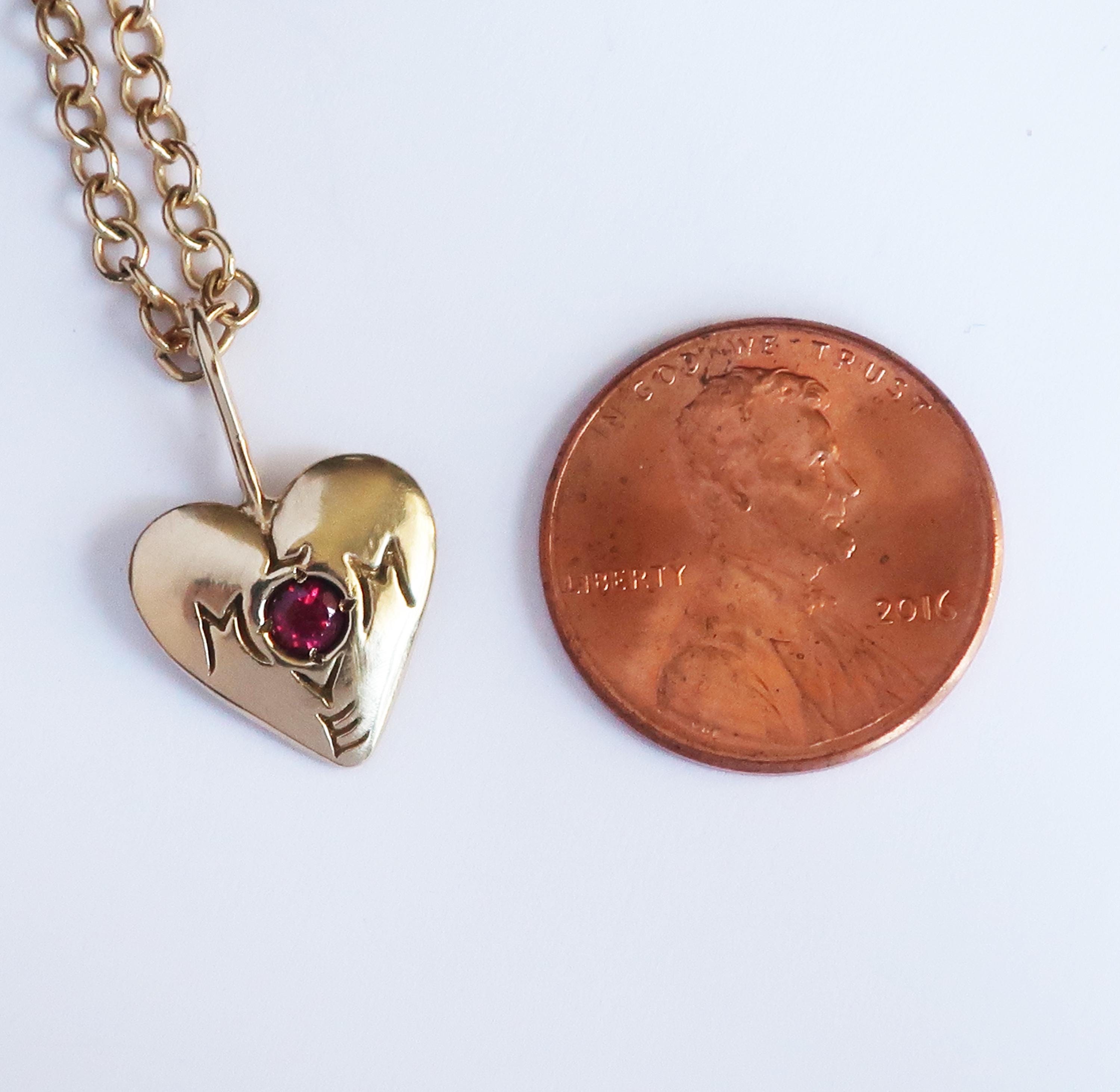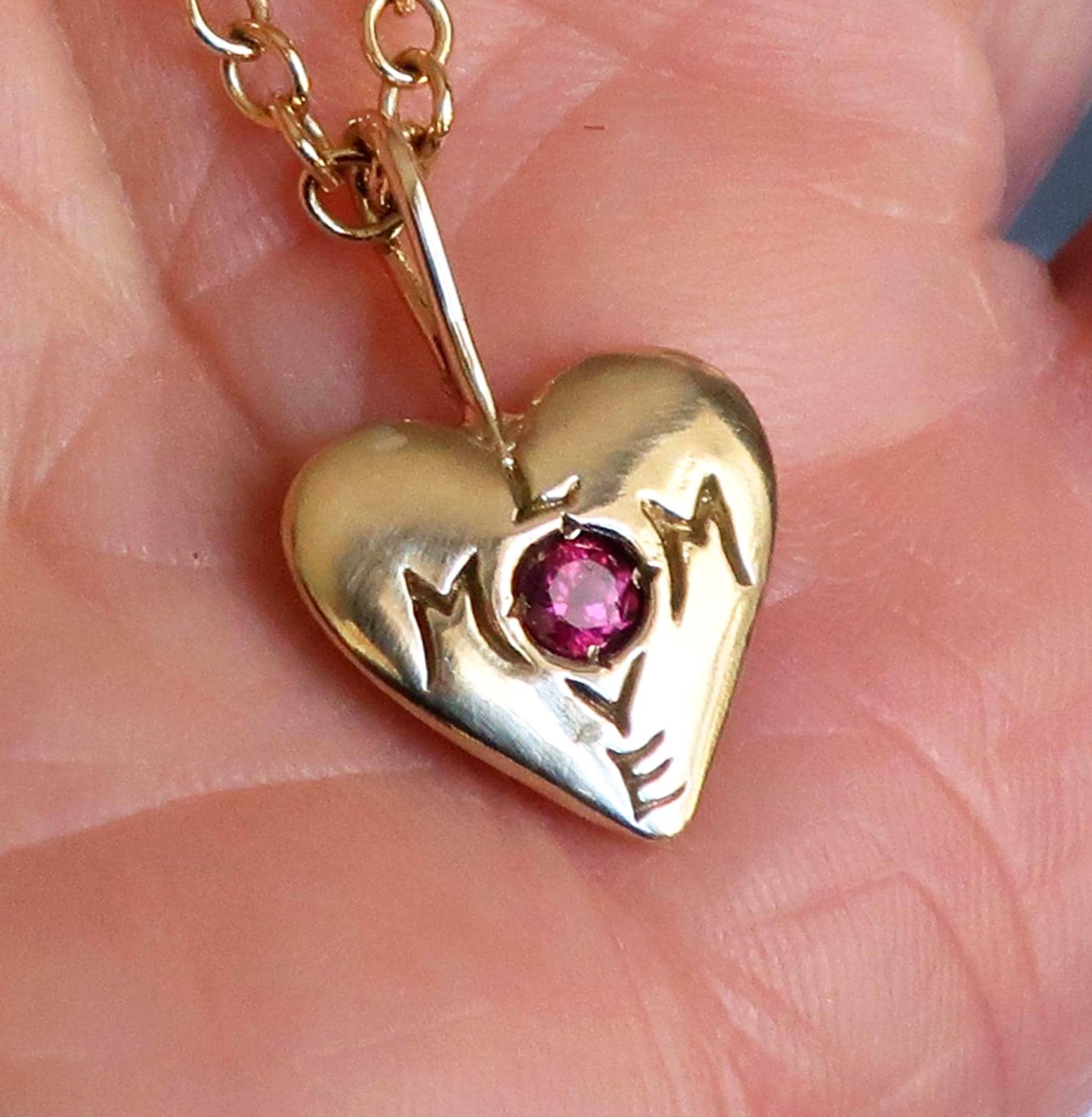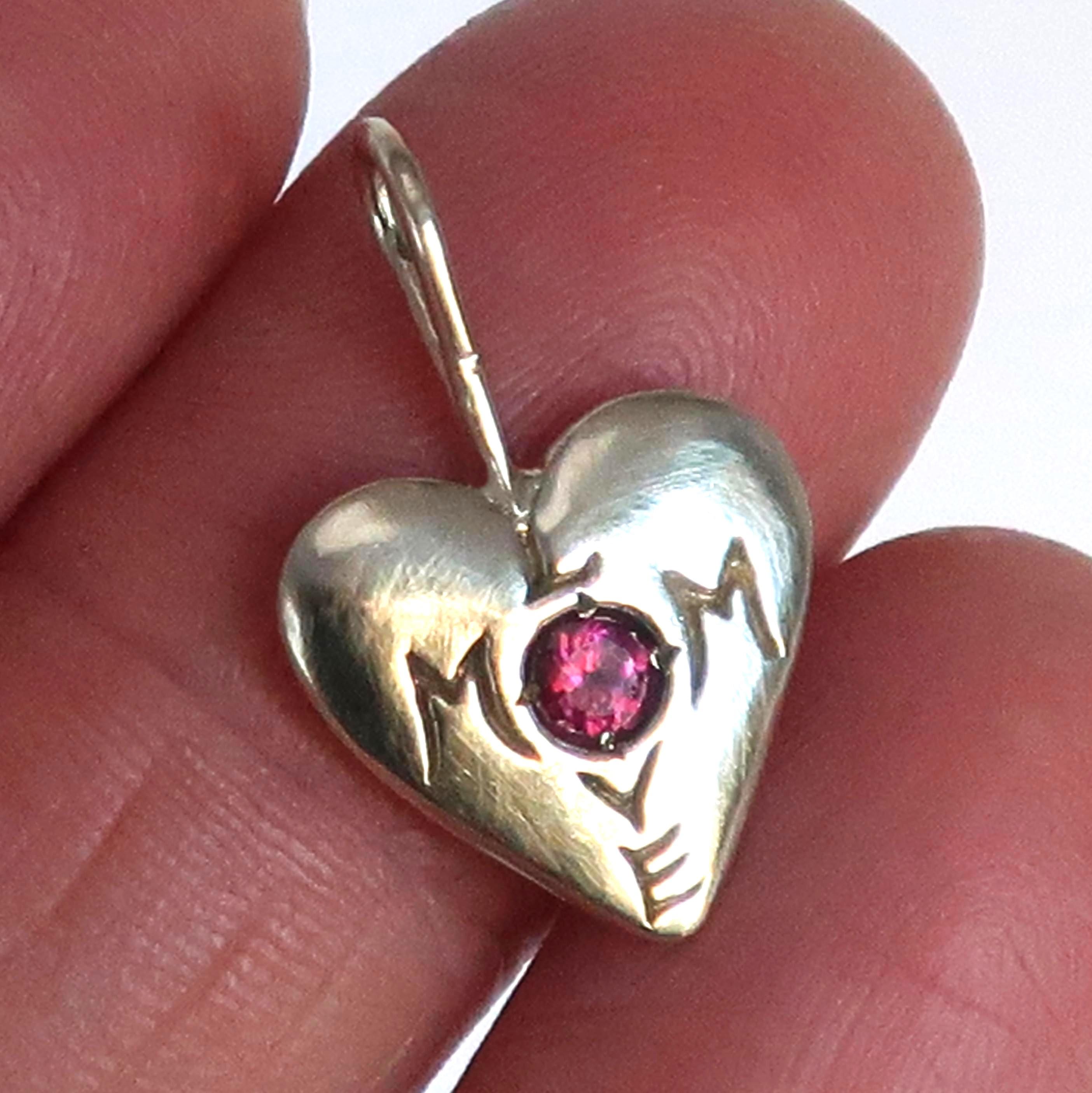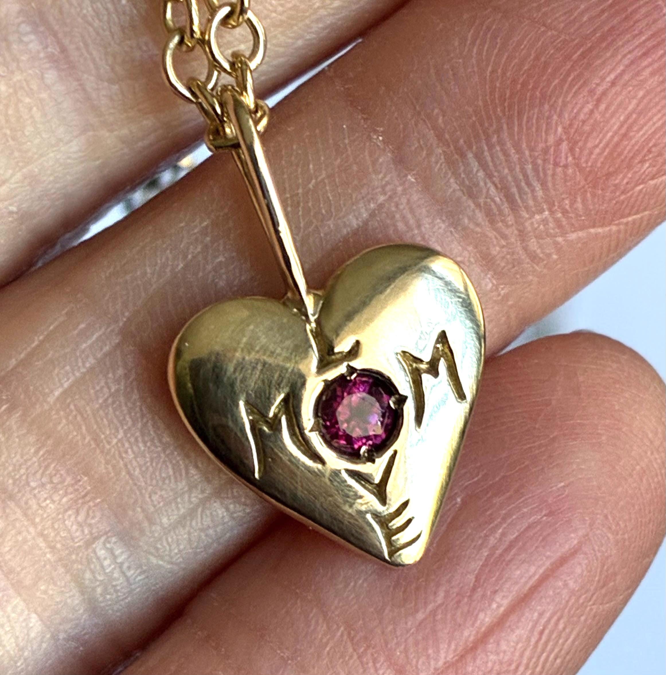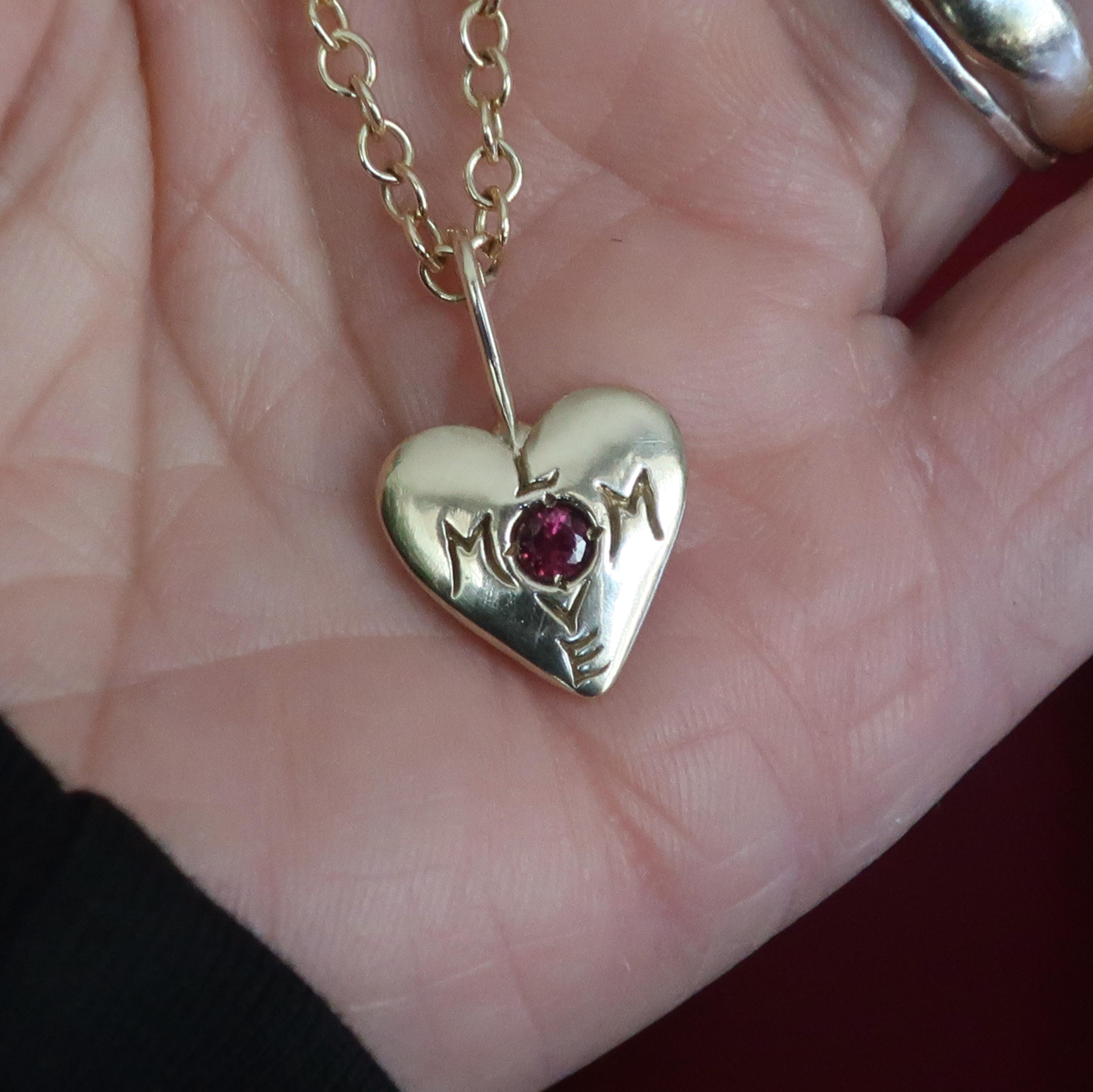 "Mom Love" Charm cast in solid 10k Yellow Gold set with a genuine pink tourmaline.