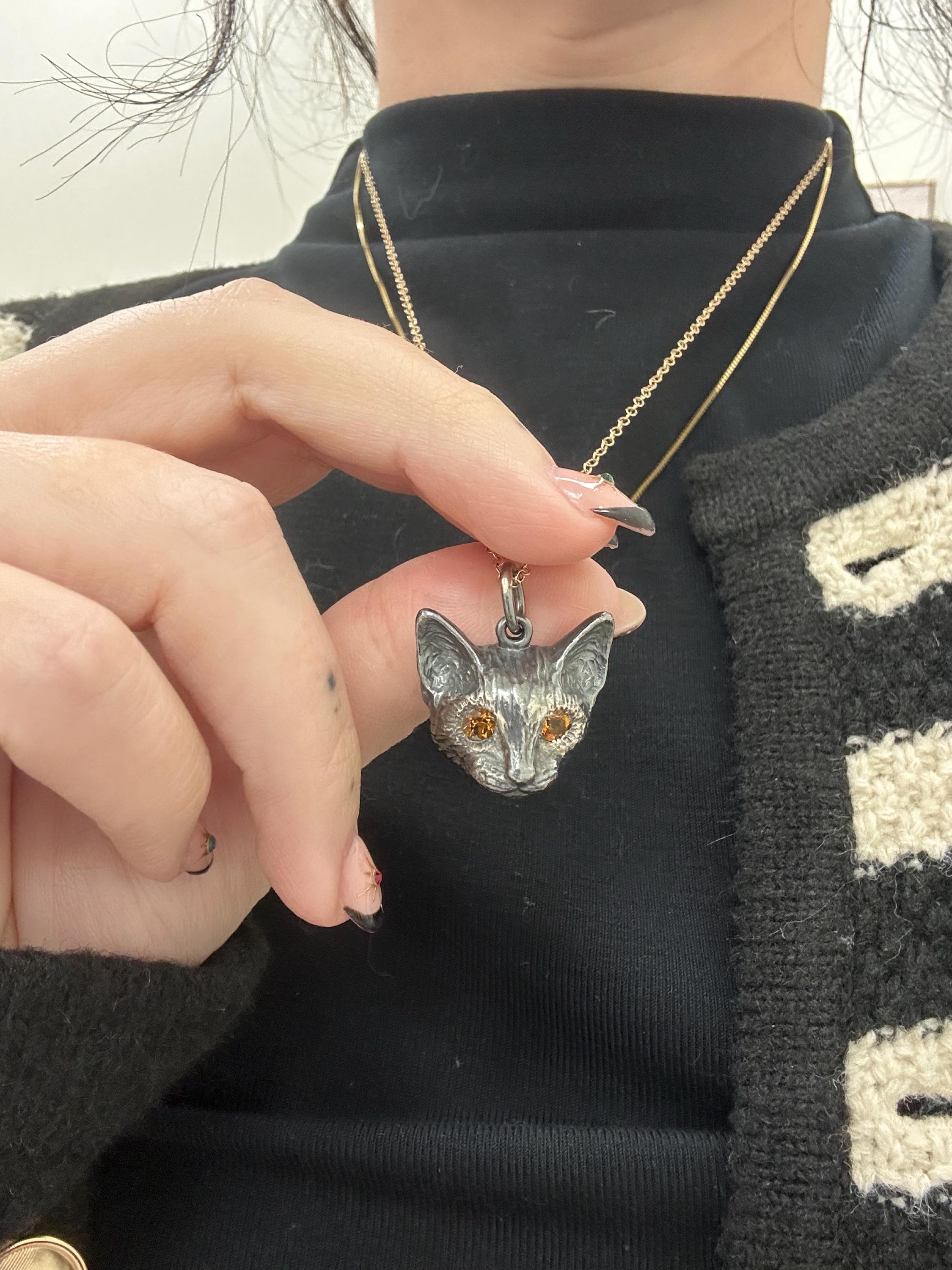 Solid blackened sterling silver large cat charm set with 4mm genuine golden citrine eyes.